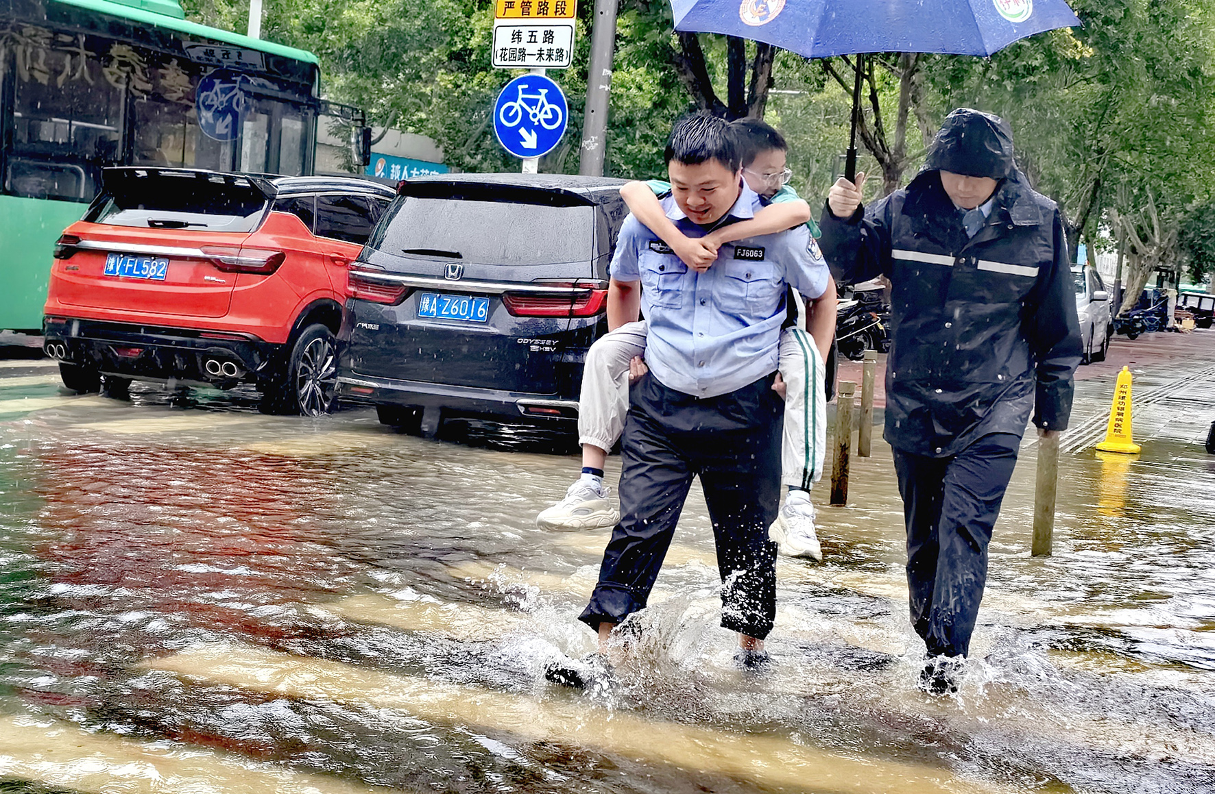 7月8日,河南省鄭州市公安局金水分局巡特警隊(duì)員在大雨中幫助小朋友經(jīng)過積水地段。