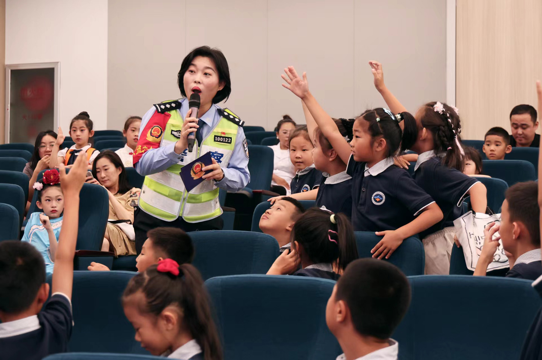 圖為7月11日,民警與學生們互動學習交通知識。