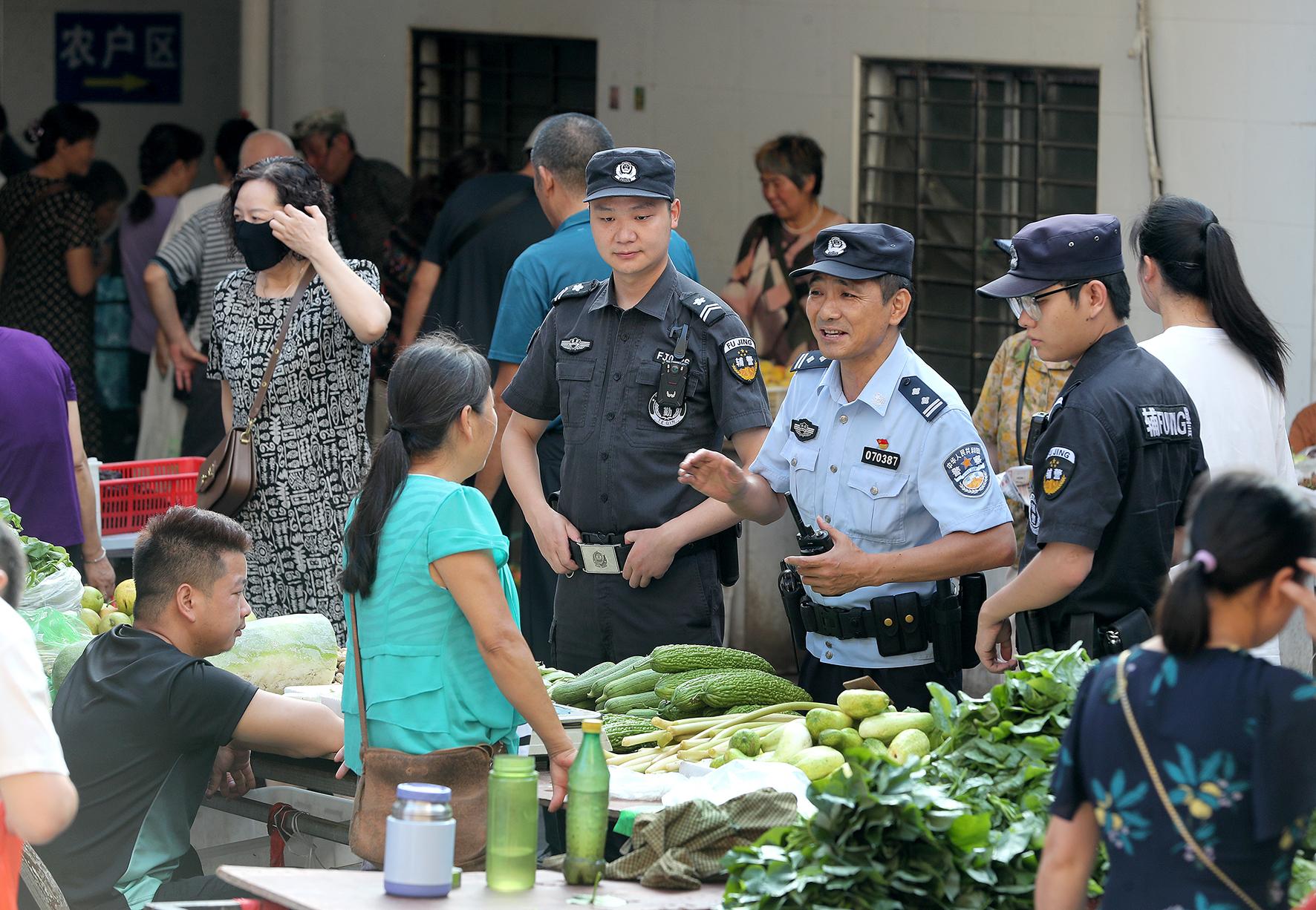 7月26日一大早,湖北省荊門市公安局巡特警支隊(duì)生態(tài)運(yùn)動(dòng)公園警務(wù)站民輔警在惠民市場(chǎng),向商戶開展反扒防盜、安全防范等法治宣傳。