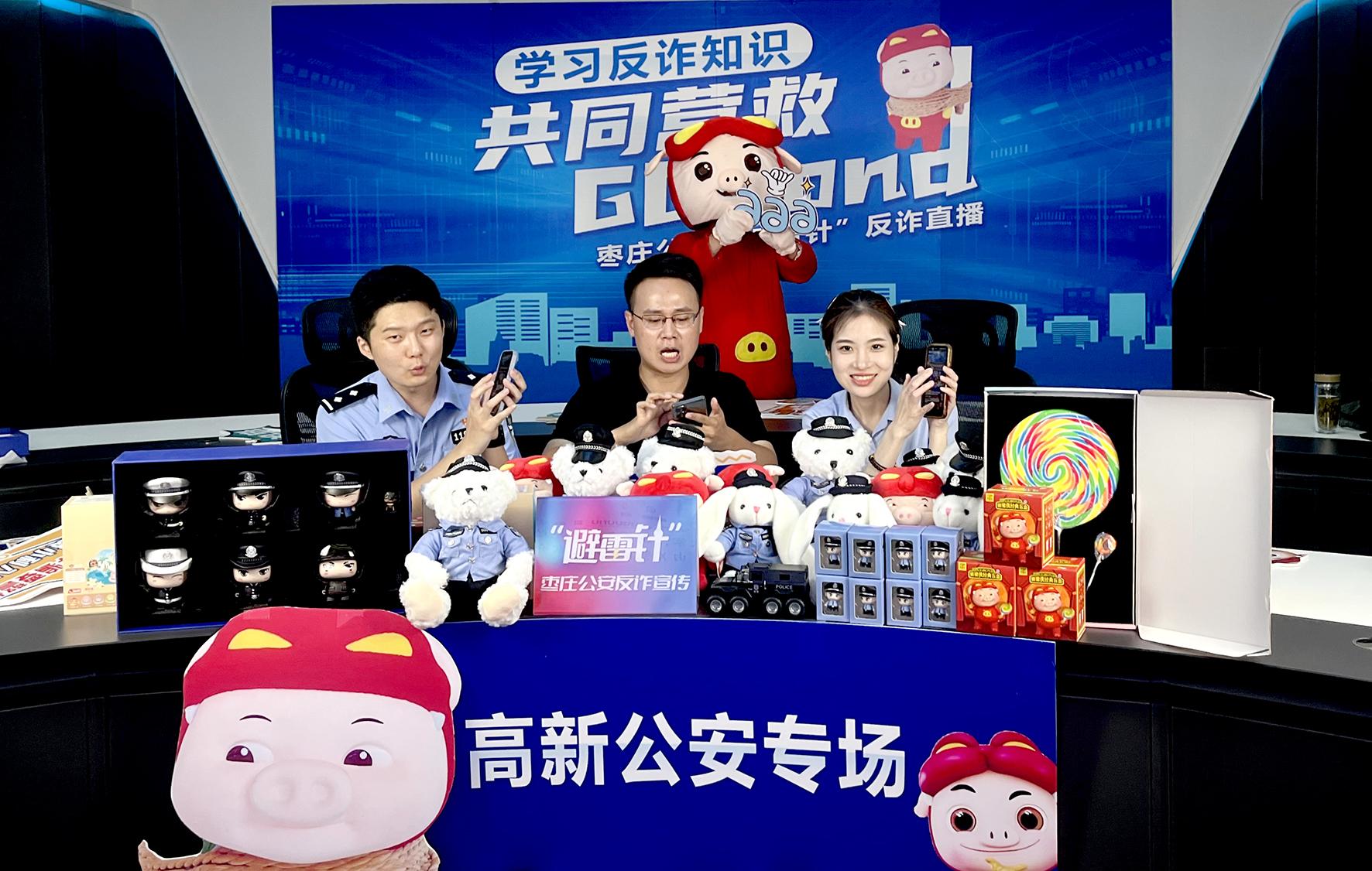 7月28日,在山東省棗莊市公安局高新分局“避雷針”反詐專場(chǎng)直播間,民警和反詐志愿者通過(guò)網(wǎng)絡(luò)直播宣傳反電詐知識(shí)。
