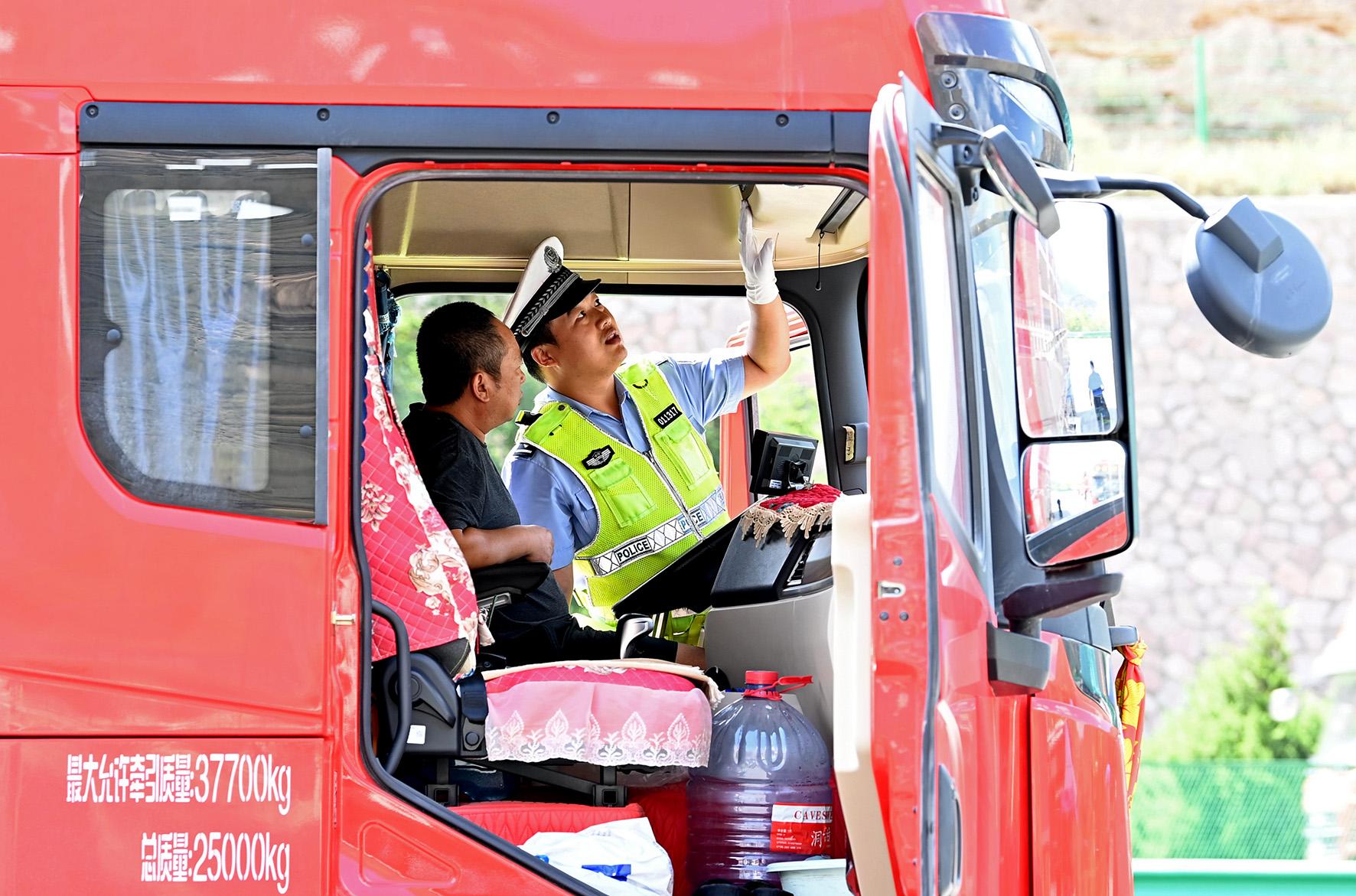 7月31日,甘肅省蘭州市公安局交警支隊民警在蘭海高速蘭臨段聯(lián)防聯(lián)控交管站,對過往三軸以上的大貨車逐車進(jìn)行登記檢查,提醒駕駛?cè)藝?yán)格遵守高風(fēng)險路段規(guī)定,注意防范高溫天氣,切勿疲勞駕駛。
