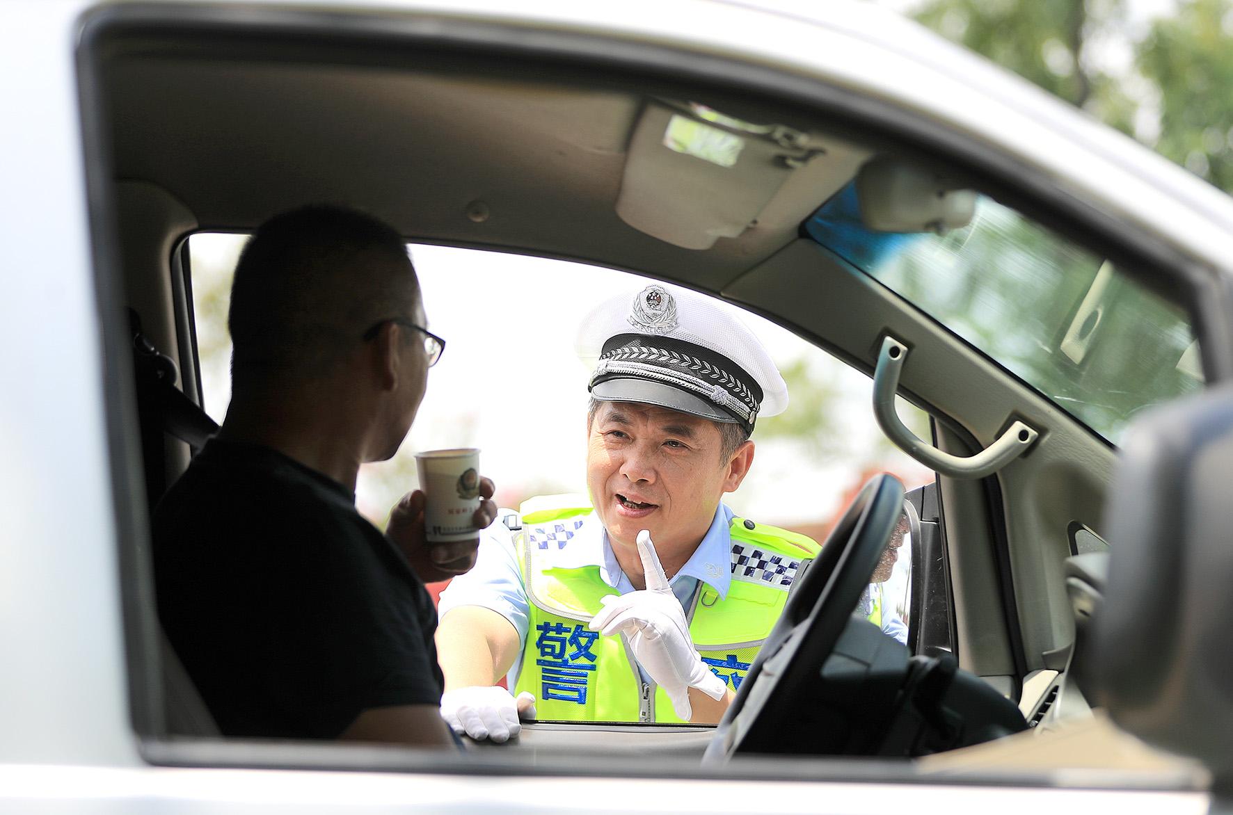 “來,喝口涼茶!”8月5日,湖北省荊門市公安局交警支隊屈家?guī)X大隊民警在S247省道,免費為過往司乘人員提供“平安涼茶”。