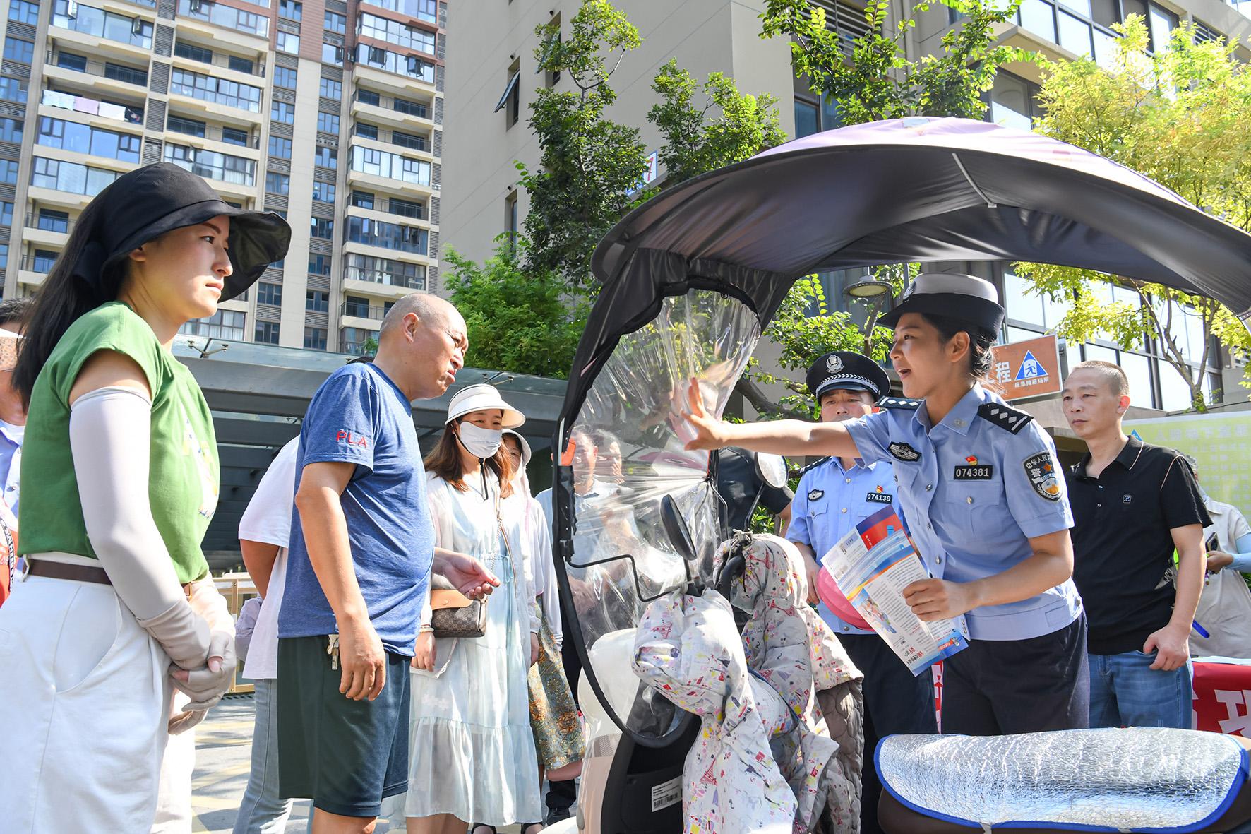 圖為民警向群眾講解電動車遮陽棚的危害。