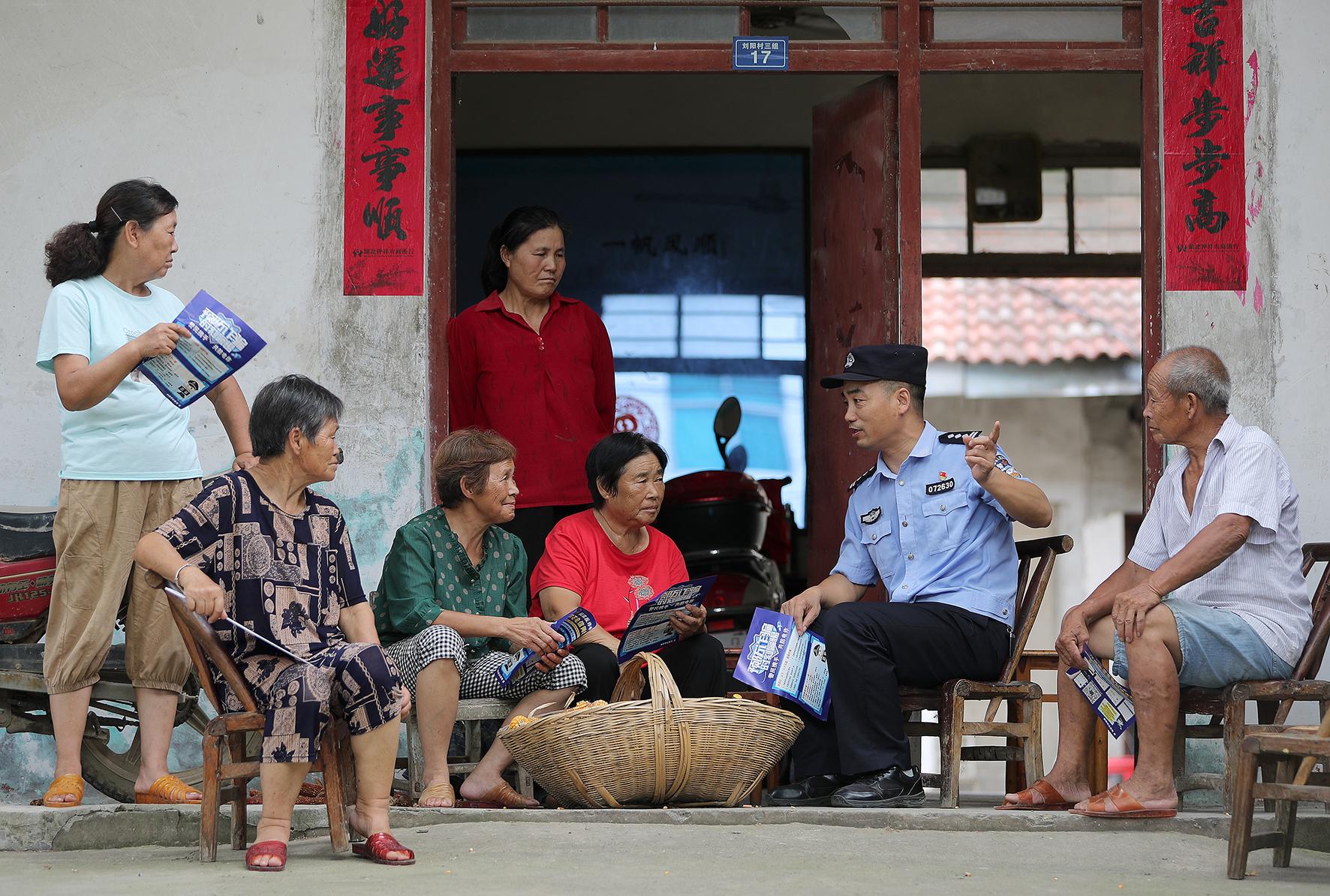 圖為8月6日,磷礦派出所民警在劉陽村,通過拉家常、講案例等形式,向老年群體宣傳防范養(yǎng)老詐騙知識。