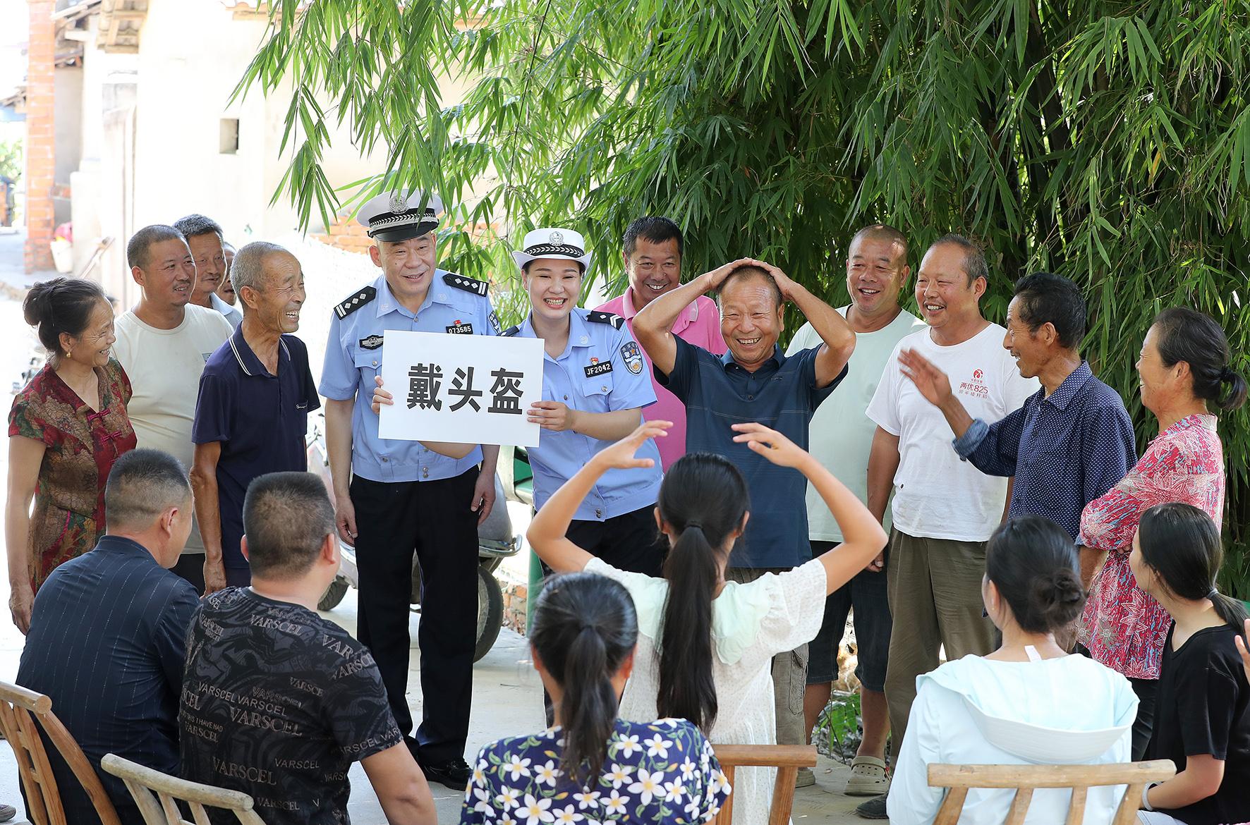 8月13日,在湖北省荊門(mén)市沙洋縣李市鎮(zhèn)新城村,沙洋縣公安局交警大隊(duì)民警通過(guò)“我比你猜”趣味活動(dòng),向村民宣傳交通安全知識(shí)。