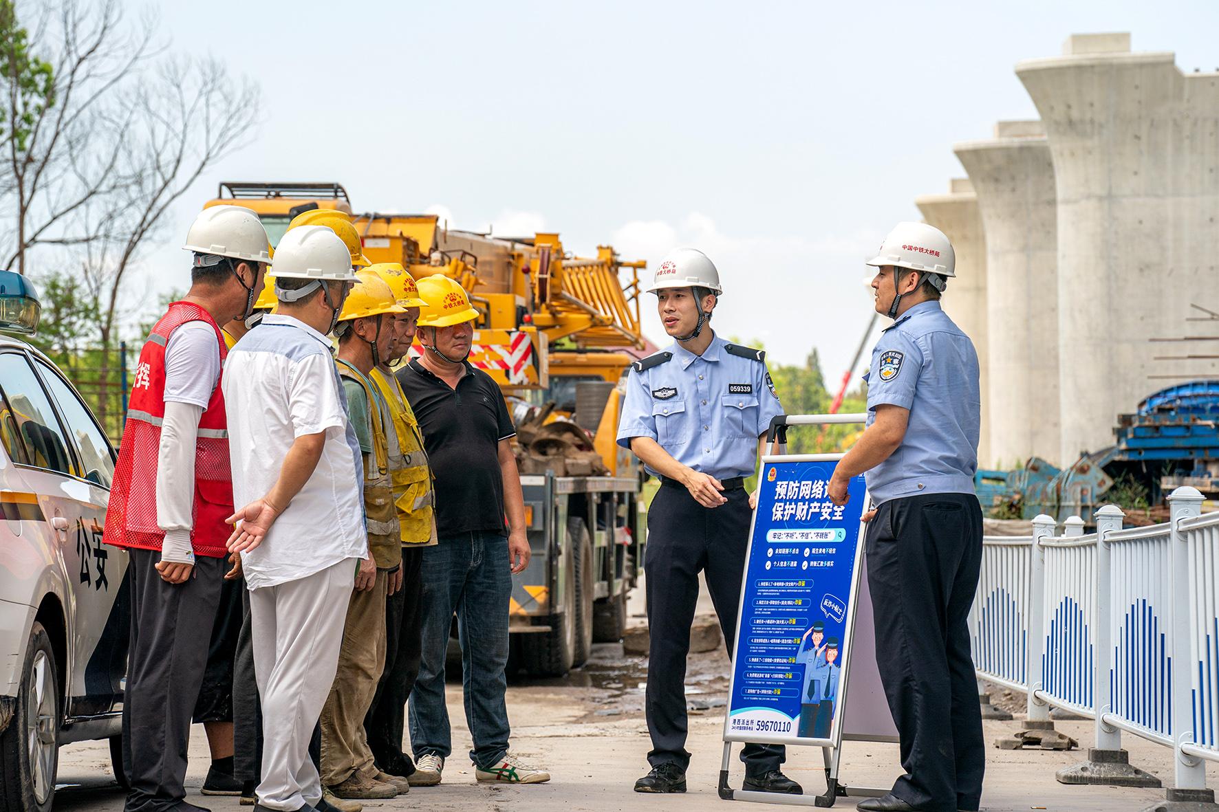 圖為8月21日,港西派出所民警來到轄區(qū)“滬渝蓉高鐵”在建工地開展電信網(wǎng)絡(luò)詐騙防范宣傳。