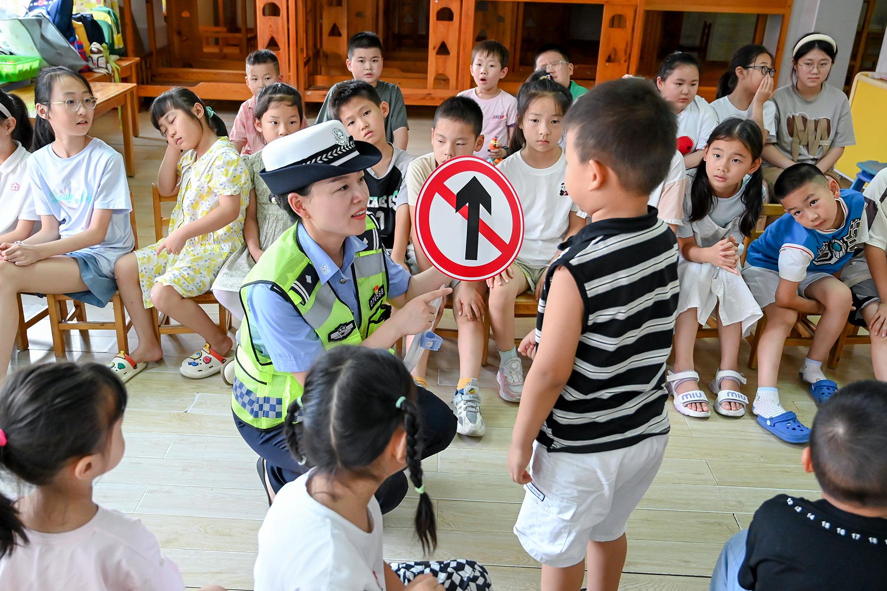 8月23日,安徽省馬鞍山市和縣公安局民警在“警寶”暑托班給孩子們上交通安全課,培養(yǎng)孩子們文明守法出行的好習慣。