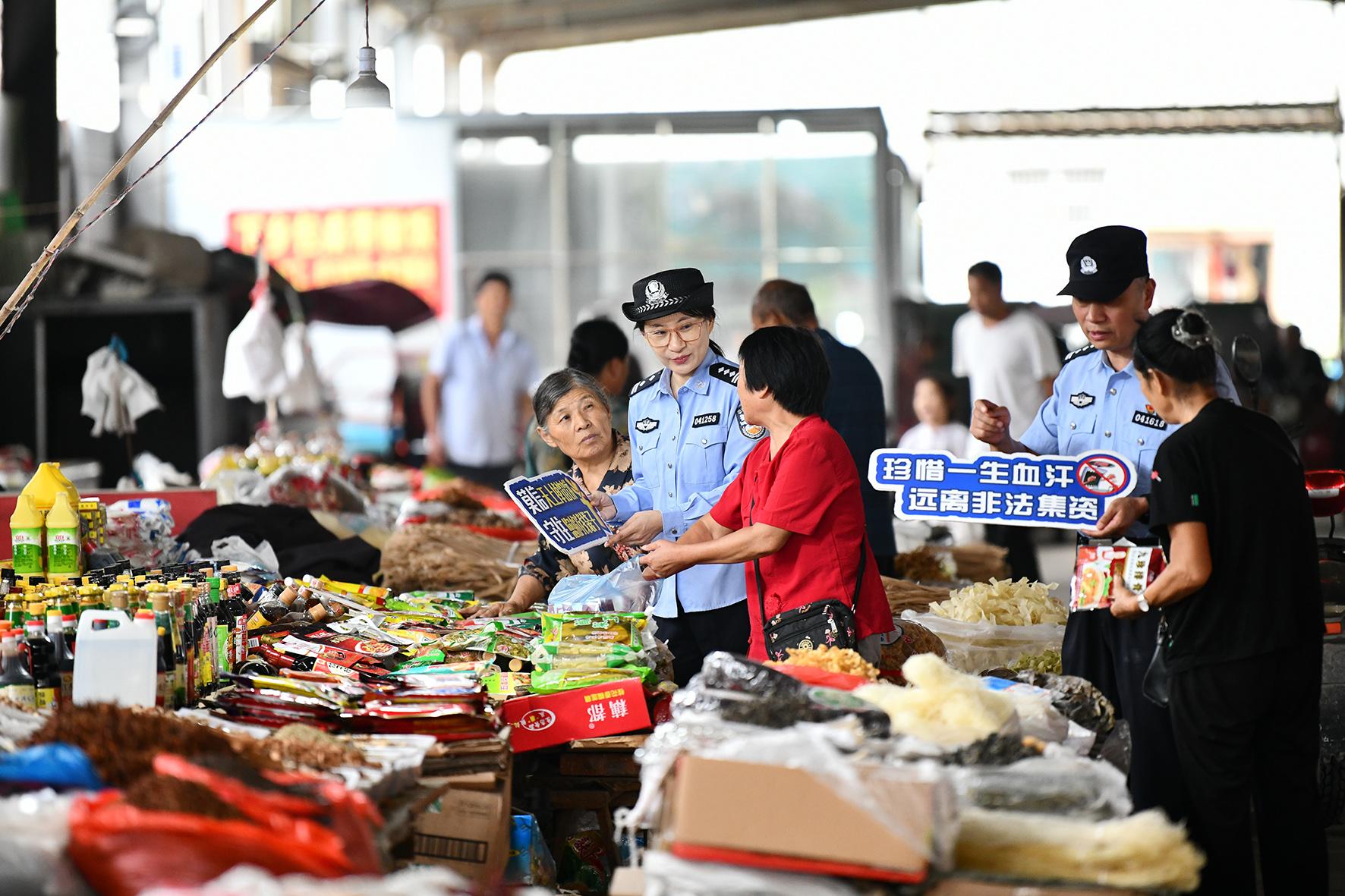 8月27日,安徽省阜南縣公安局民警在農貿市場向群眾宣講養(yǎng)老詐騙、非法集資、經(jīng)營式傳銷等經(jīng)濟犯罪的手段和危害性。
