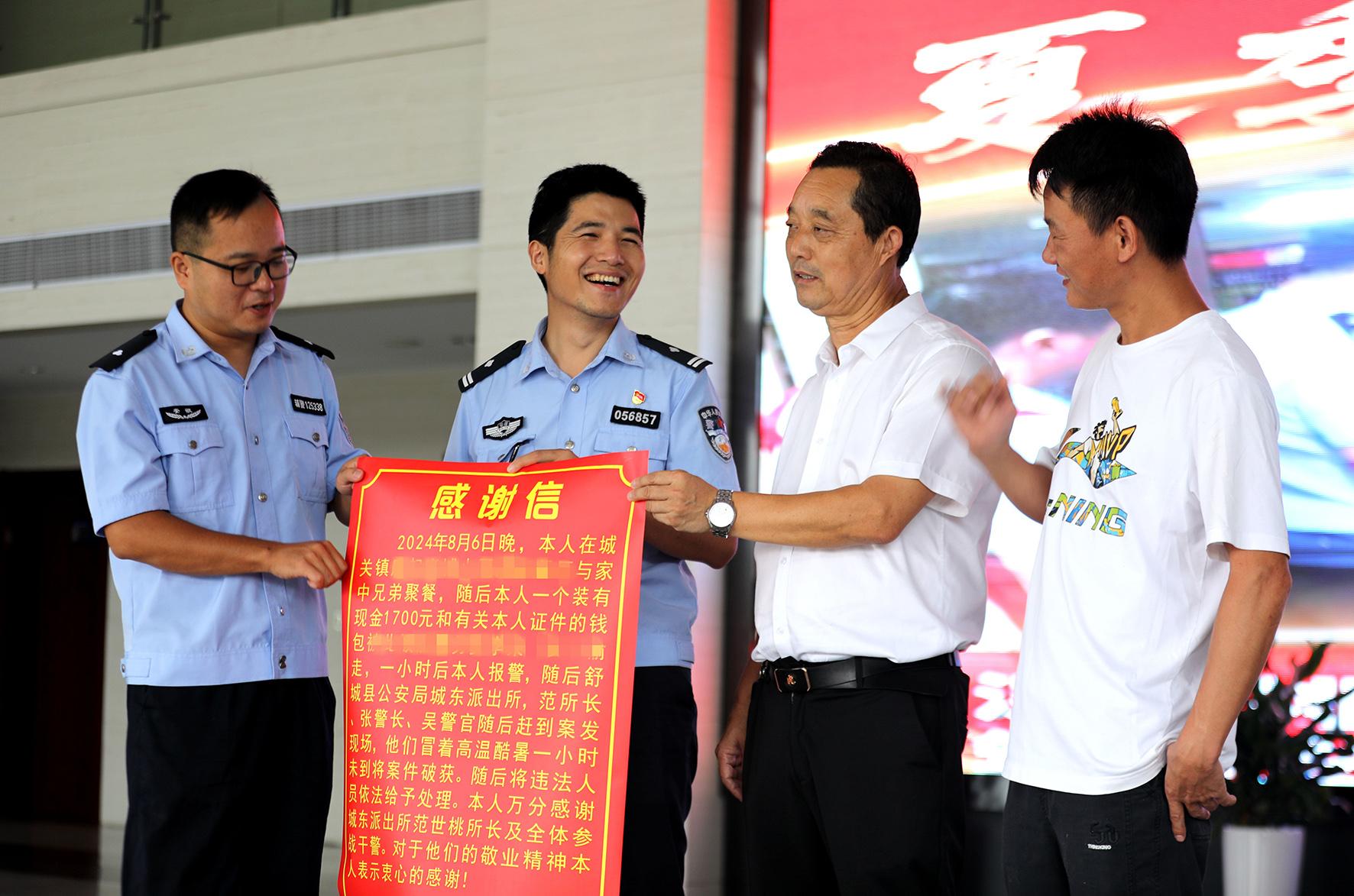 “我要把這封‘走心’的感謝信,送給‘用心’的警官們!”9月3日,家住安徽省舒城縣城關(guān)鎮(zhèn)的周先生手持“超大號(hào)”感謝信來到舒城縣公安局城東派出所,感謝民警快速破案并幫其找回財(cái)物。