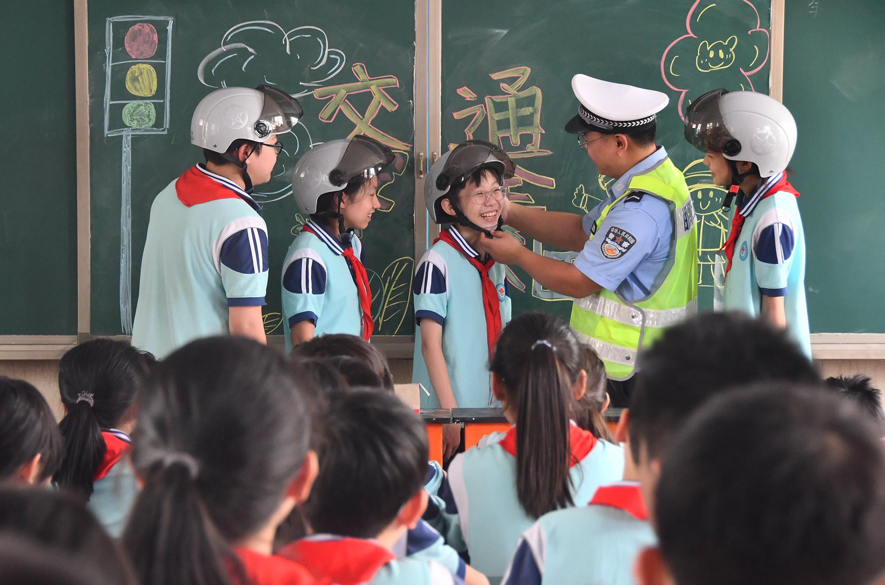 圖為民警向?qū)W生講解安全頭盔的正確佩戴方法。