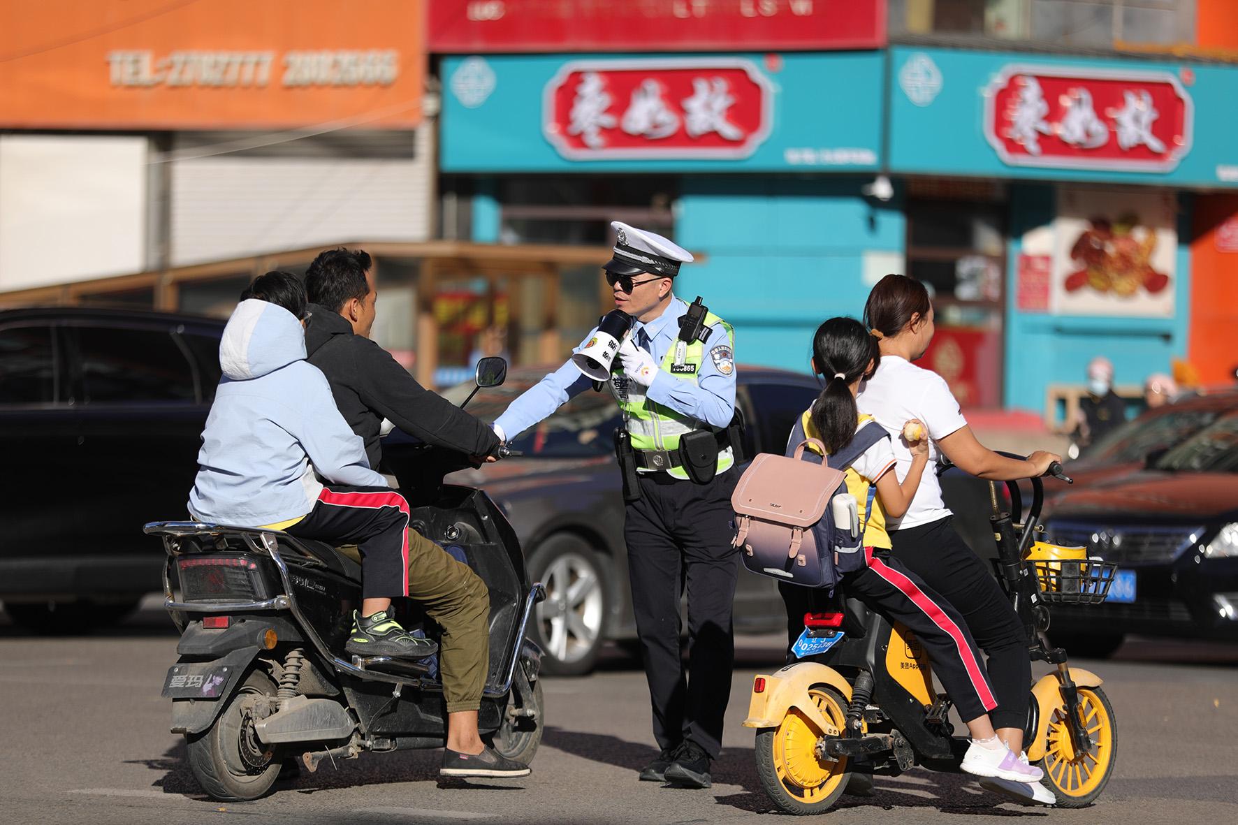 9月12日,遼寧省阜新市公安局交警支隊海州大隊民警叫停糾正不戴頭盔的駕駛人,用文明勸導的方式為城市交通筑起安全防線,讓出行更安全、有序、文明。