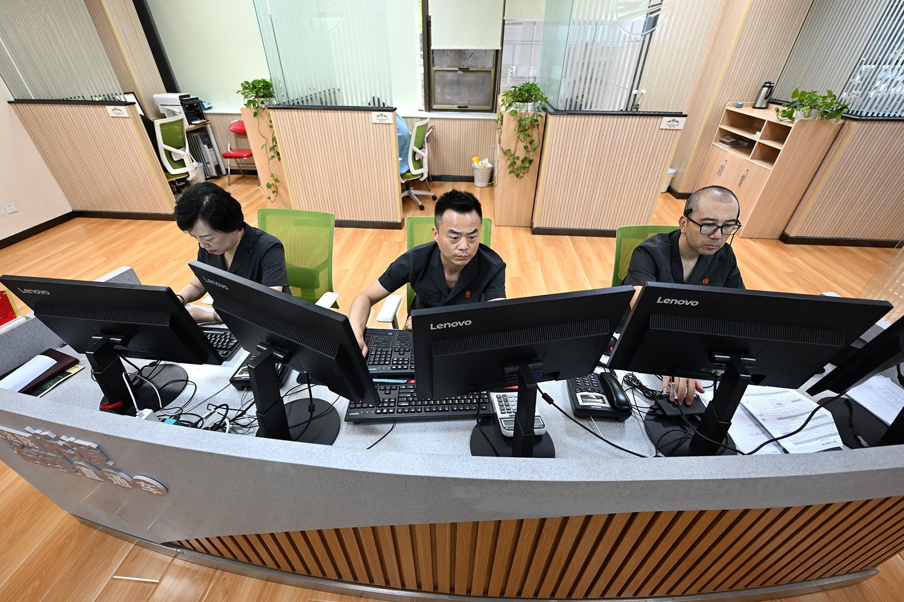 法官助理劉鑫鵬在立案窗口耐心細(xì)致地審核當(dāng)事人的立案材料。