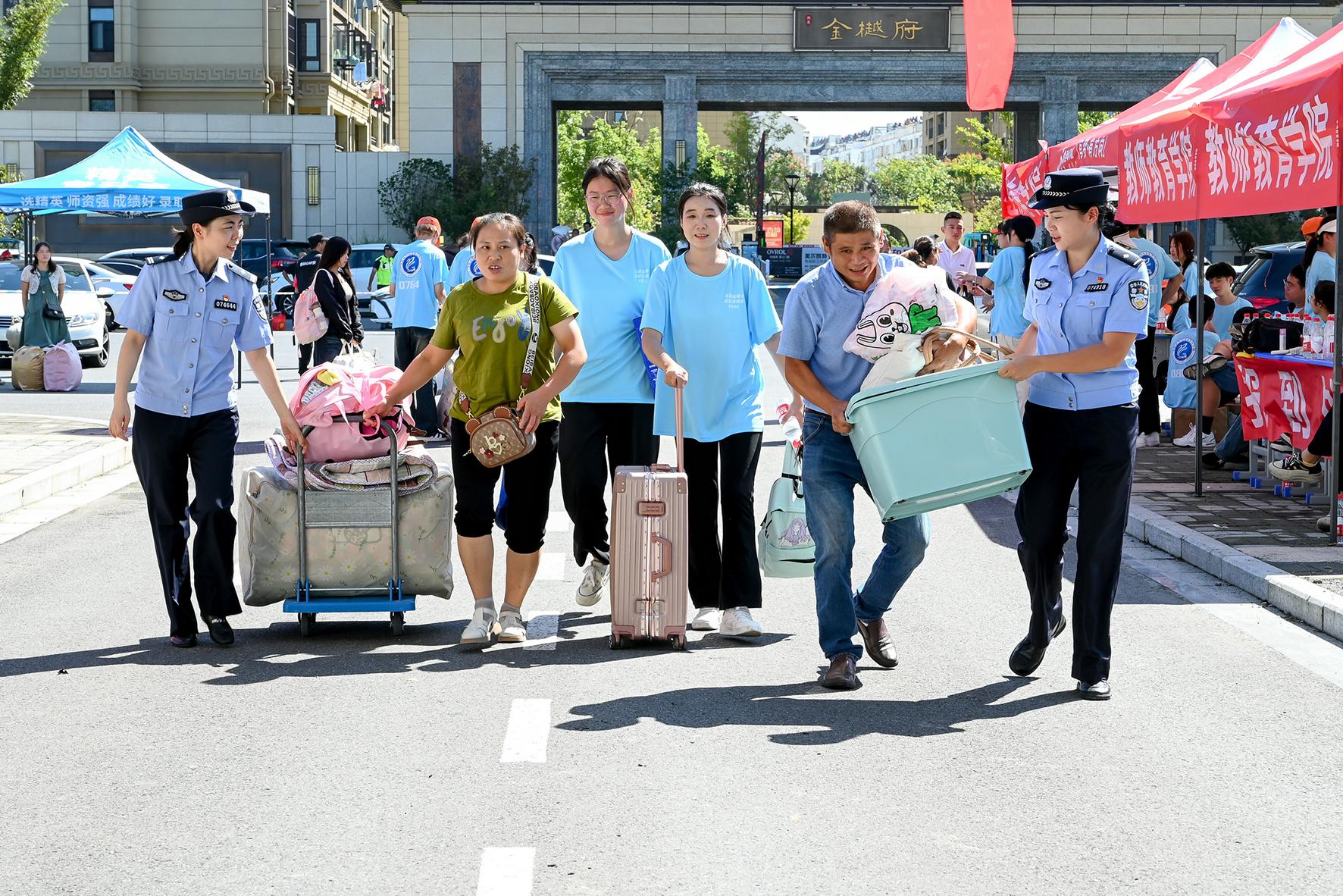 9月18日,在安徽省馬鞍山師范高等??茖W(xué)校,和縣公安局歷陽派出所民警正在幫助大一新生搬運(yùn)行李,并對新生及家長開展反詐、禁毒普法宣傳。