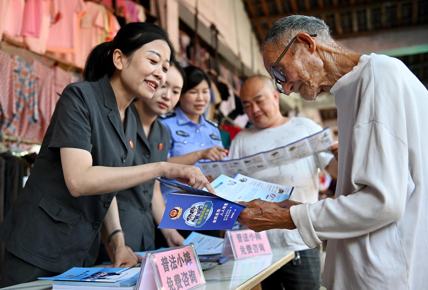 9月19日,湖南省洞口縣人民法院干警在楊林鎮(zhèn)農(nóng)貿(mào)市場(chǎng)向群眾宣講法律知識(shí)。連日來(lái),洞口縣人民法院干警利用當(dāng)?shù)剜l(xiāng)村趕集日,向群眾宣講防范非法集資、反詐、民法典等法律知識(shí)。