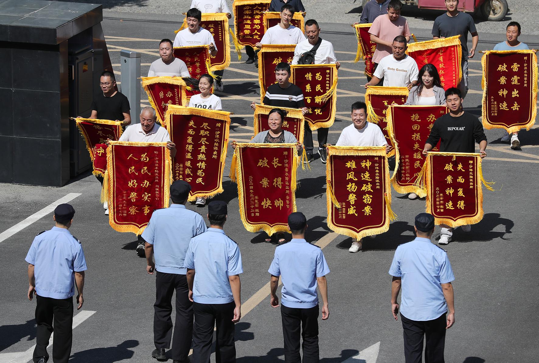9月23日,湖北省荊門市沙洋縣20名群眾組團(tuán)向沙洋縣公安局沙洋水陸派出所民警送上十八面錦旗,感謝辦案民警為他們追回被盜、被騙財(cái)物。