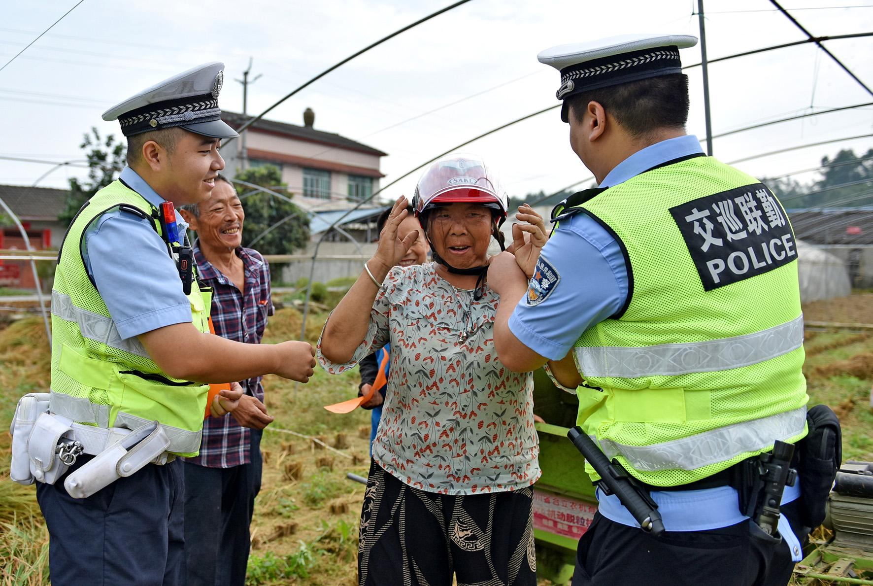 9月24日,四川省綿陽市公安局交警支隊直屬二大隊民輔警來到田間地頭,向村民講解駕乘摩托不佩戴安全頭盔、超員等交通違法行為的危害,進一步增強村民的守法和交通安全意識。