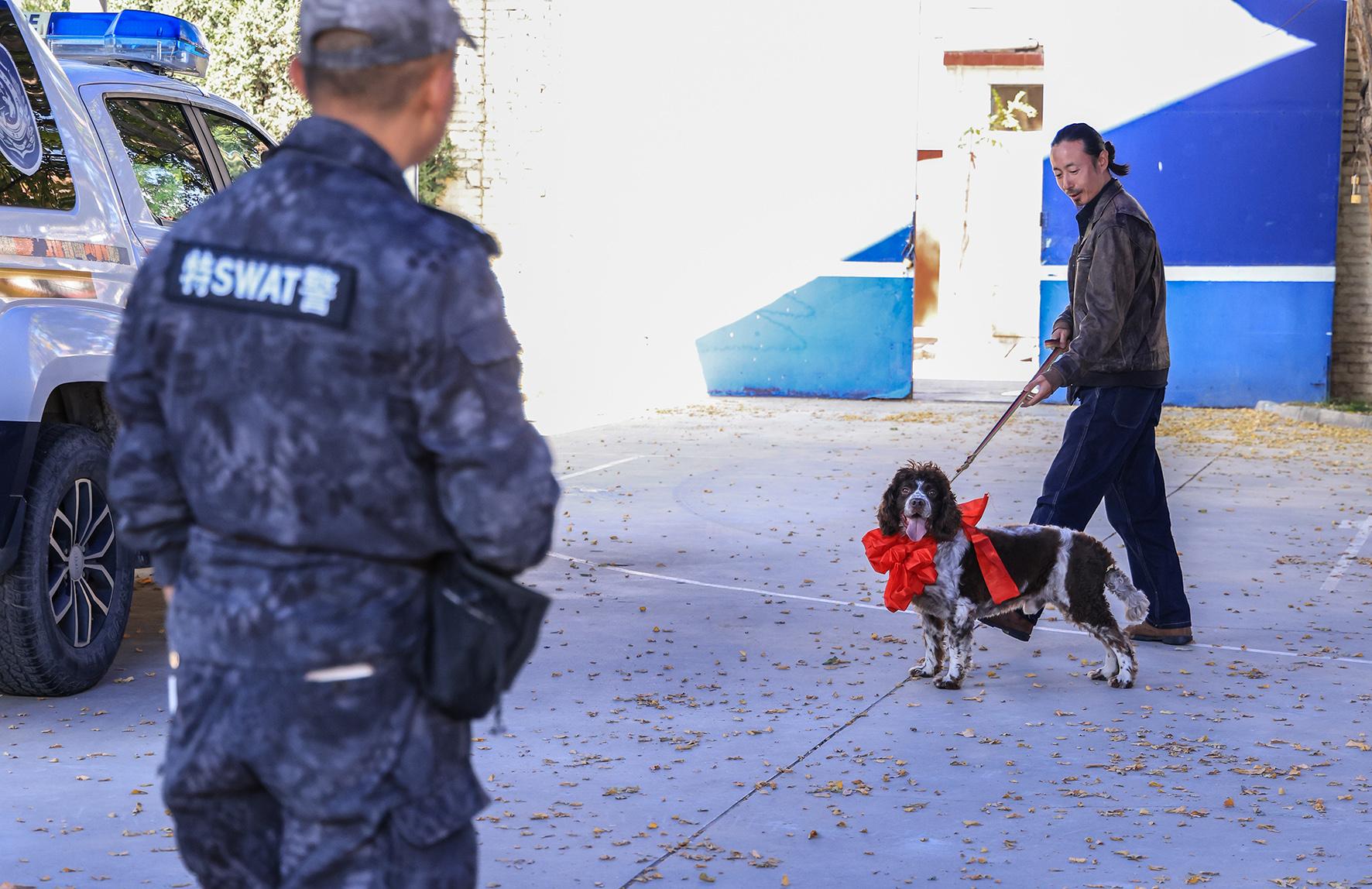 10月22日,在甘肅蘭州市公安局城關分局服役5年零9個月的警犬“山藥”退役被愛心人士領養(yǎng),大家為“山藥”舉行了簡短的退役儀式。