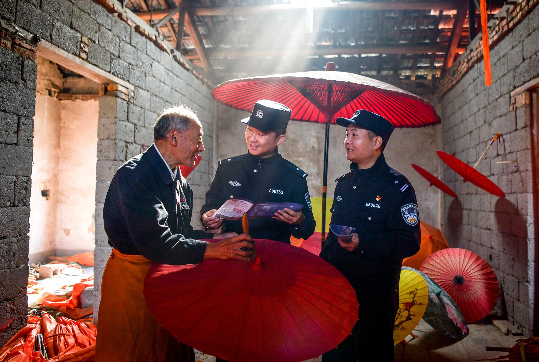 為護(hù)航非物質(zhì)文化遺產(chǎn)健康發(fā)展,11月4日,安徽省涇縣公安局昌橋派出所民警來到昌橋鄉(xiāng)孤峰油紙傘廠,開展“嘮家常 話安全”活動。