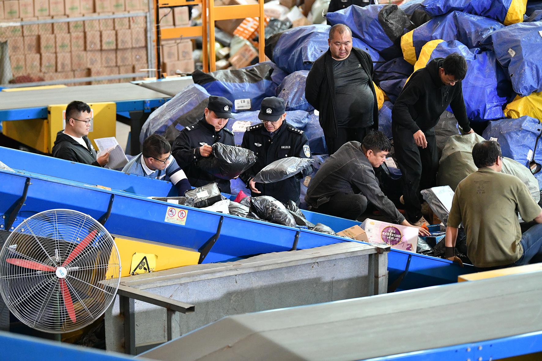 11月4日,安徽省阜南縣公安局經(jīng)開區(qū)派出所民警在一快遞物流分揀中心進(jìn)行安全檢查。隨著“雙十一”臨近,阜南縣公安局經(jīng)濟(jì)開發(fā)區(qū)派出所組織警力對(duì)轄區(qū)物流寄遞業(yè)的寄遞包裹實(shí)名登記、辦公場(chǎng)所的公共視頻及消防措施設(shè)置等進(jìn)行安全檢查,消除物流寄遞行業(yè)安全隱患。