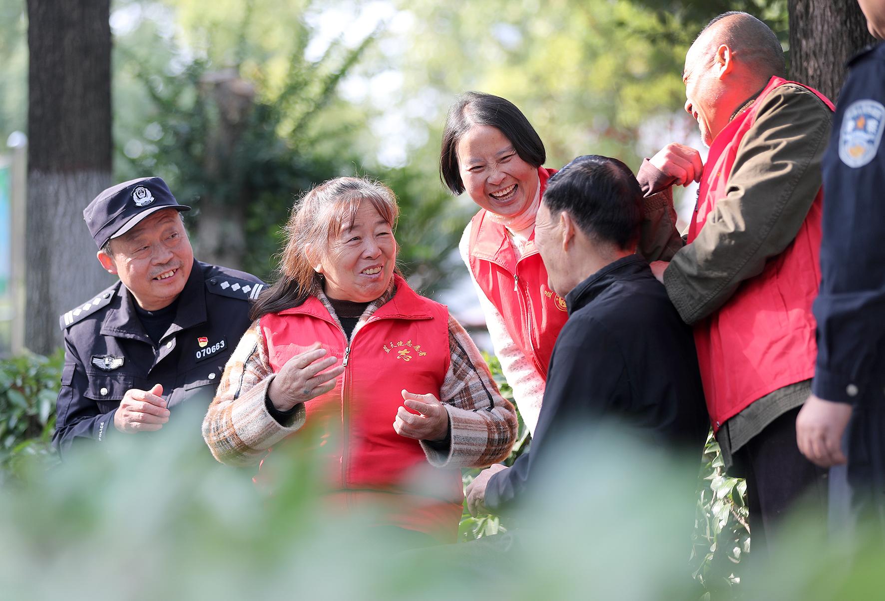 圖為11月5日,民警與救助對象一起在公園向老年人開展防范養(yǎng)老詐騙普法宣傳活動。