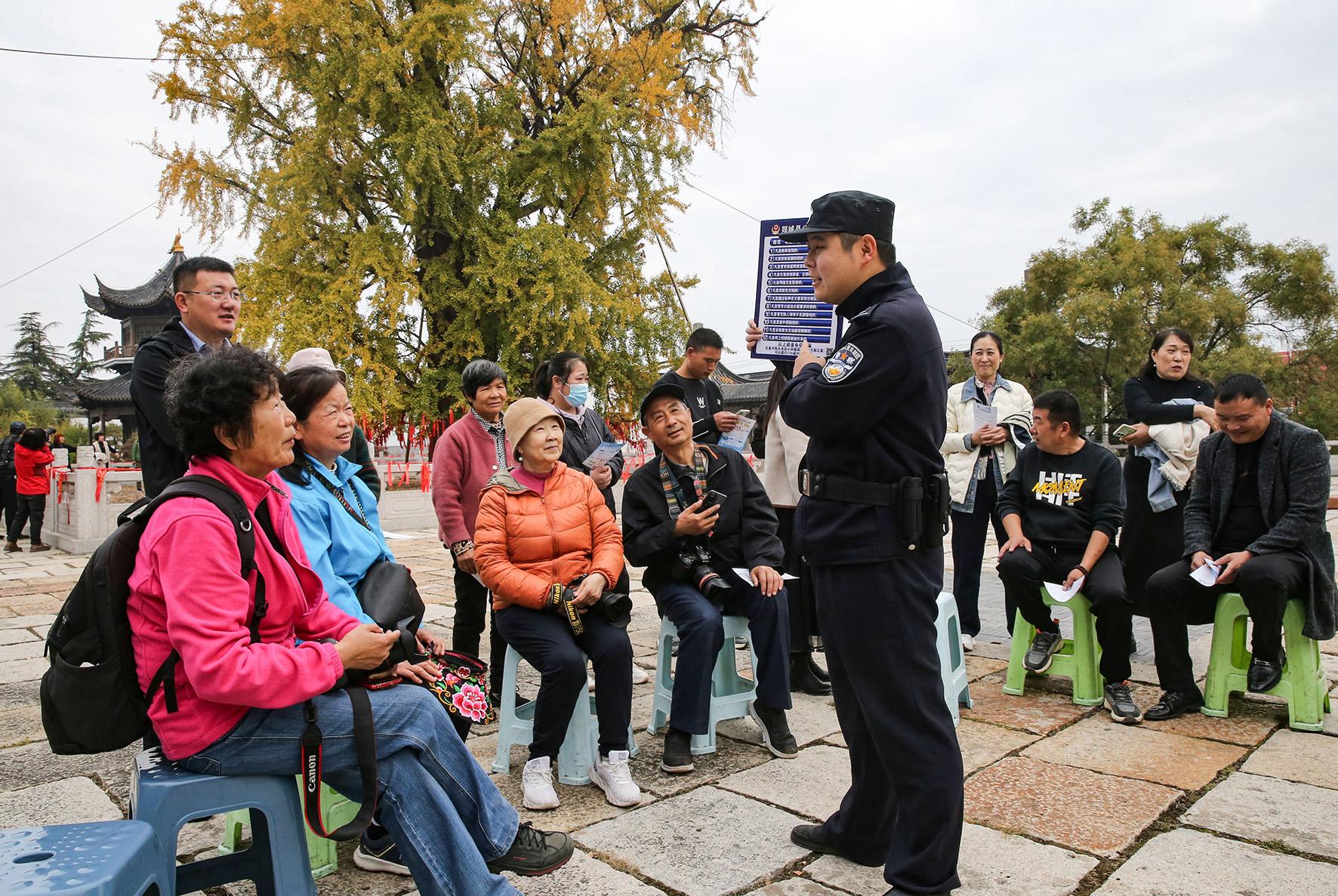 11月10日,山東省臨沂市郯城縣公安局新村派出所民警走進(jìn)新村三千年古銀杏樹景區(qū),向游客宣講反詐知識(shí)。