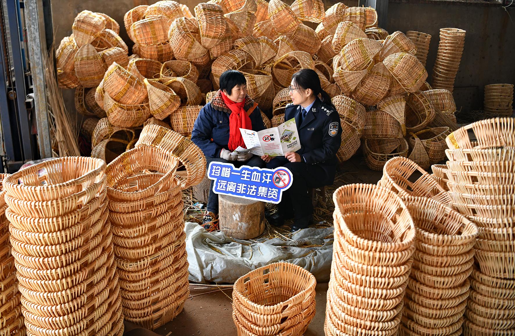 12月11日,安徽省阜南縣公安局郜臺派出所民警在轄區(qū)一柳編企業(yè)向工人宣講防騙知識。阜南縣公安局經(jīng)偵大隊(duì)聯(lián)合郜臺派出所開展“冬季送平安 送法進(jìn)企業(yè)”冬季行動(dòng)宣傳。