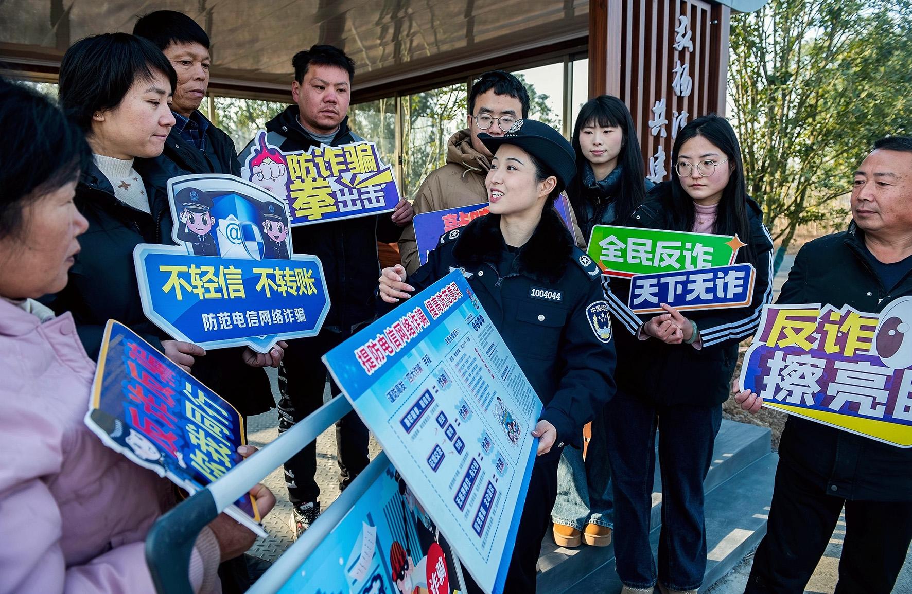 1月13日,安徽省含山縣司法局普法工作者在凌家灘景區(qū)向游客宣傳防范網(wǎng)絡(luò)電信詐騙知識。年關(guān)將至,含山縣司法局組織開展“全民反詐同行 共筑平安家園”主題宣傳活動。