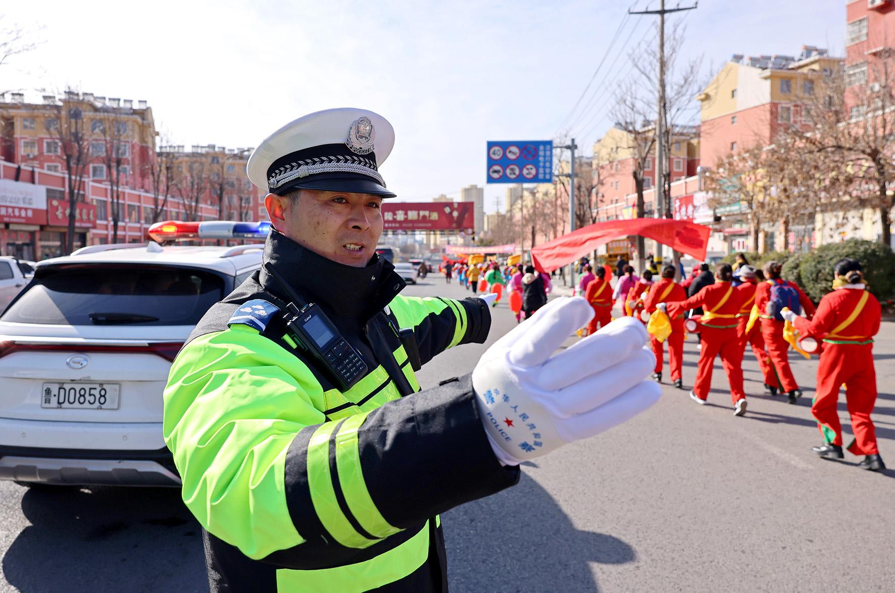 2月5日,山東省棗莊市公安局市中分局交通警察大隊組織民輔警走向街頭,服務(wù)民間游藝“踩街”表演活動。