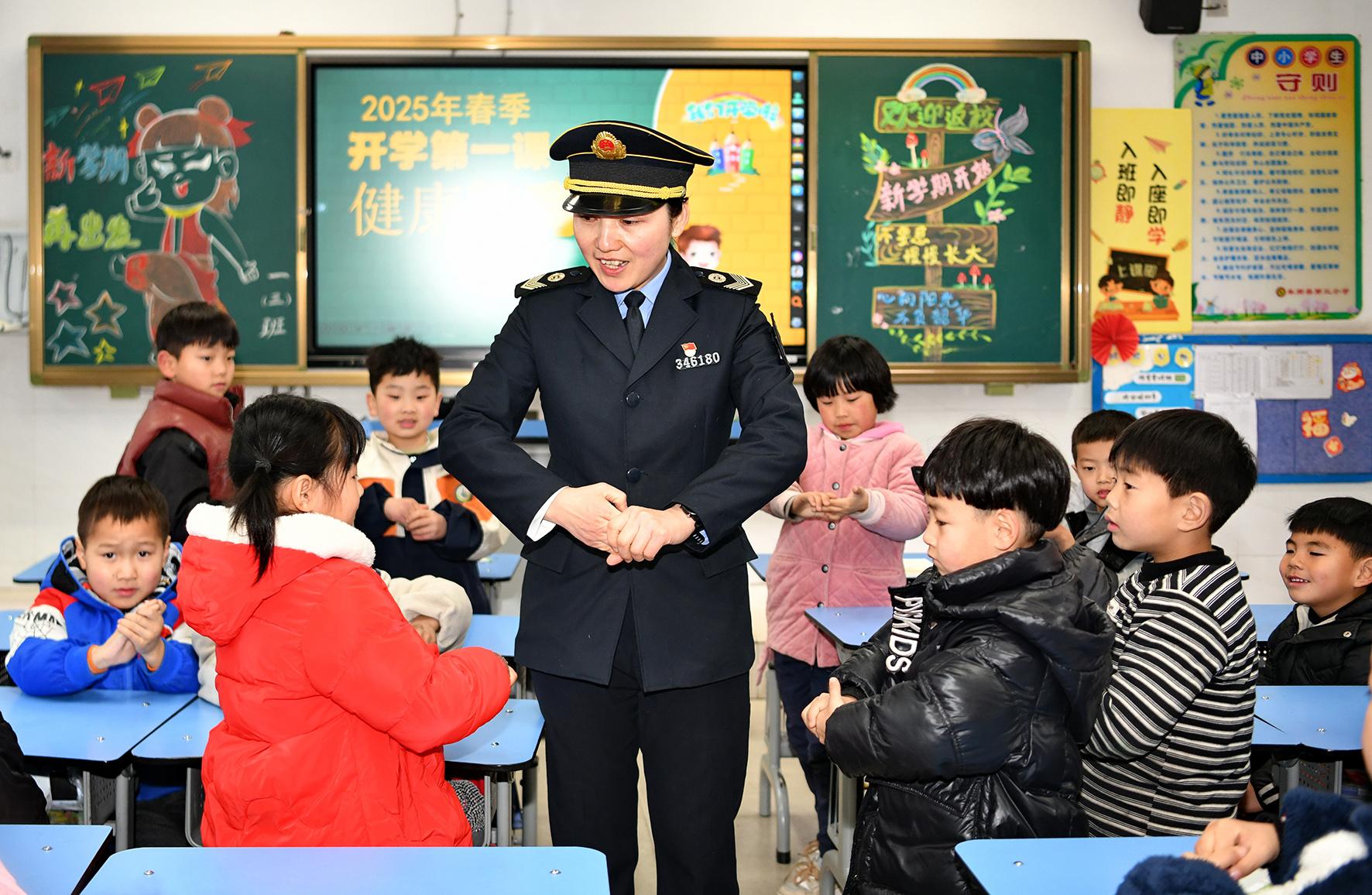 2月14日,安徽省阜南縣衛(wèi)生監(jiān)督員在第三小學(xué)向?qū)W生們講解學(xué)校衛(wèi)生知識(shí)。春季開學(xué)之際,阜南縣疾病預(yù)防控制局組織監(jiān)督員走進(jìn)轄區(qū)中小學(xué)校開展傳染病防控、預(yù)防近視和勤洗手等學(xué)生衛(wèi)生知識(shí)宣講,增強(qiáng)學(xué)生們自我健康防護(hù)意識(shí)。