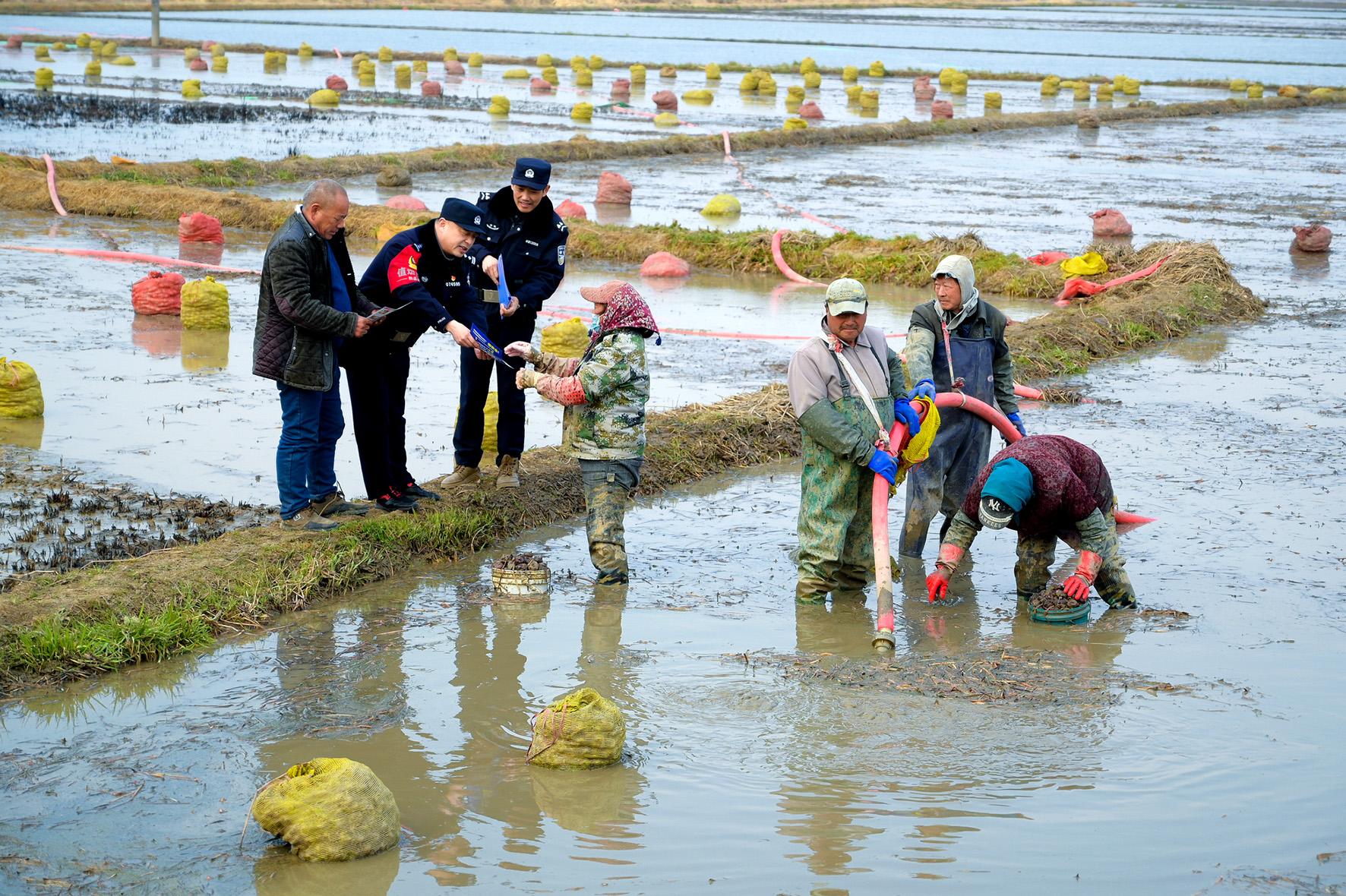 2月19日,安徽省馬鞍山市和縣公安局民警在西埠鎮(zhèn)棗林村走訪,向采收荸薺的群眾開展法治宣傳。