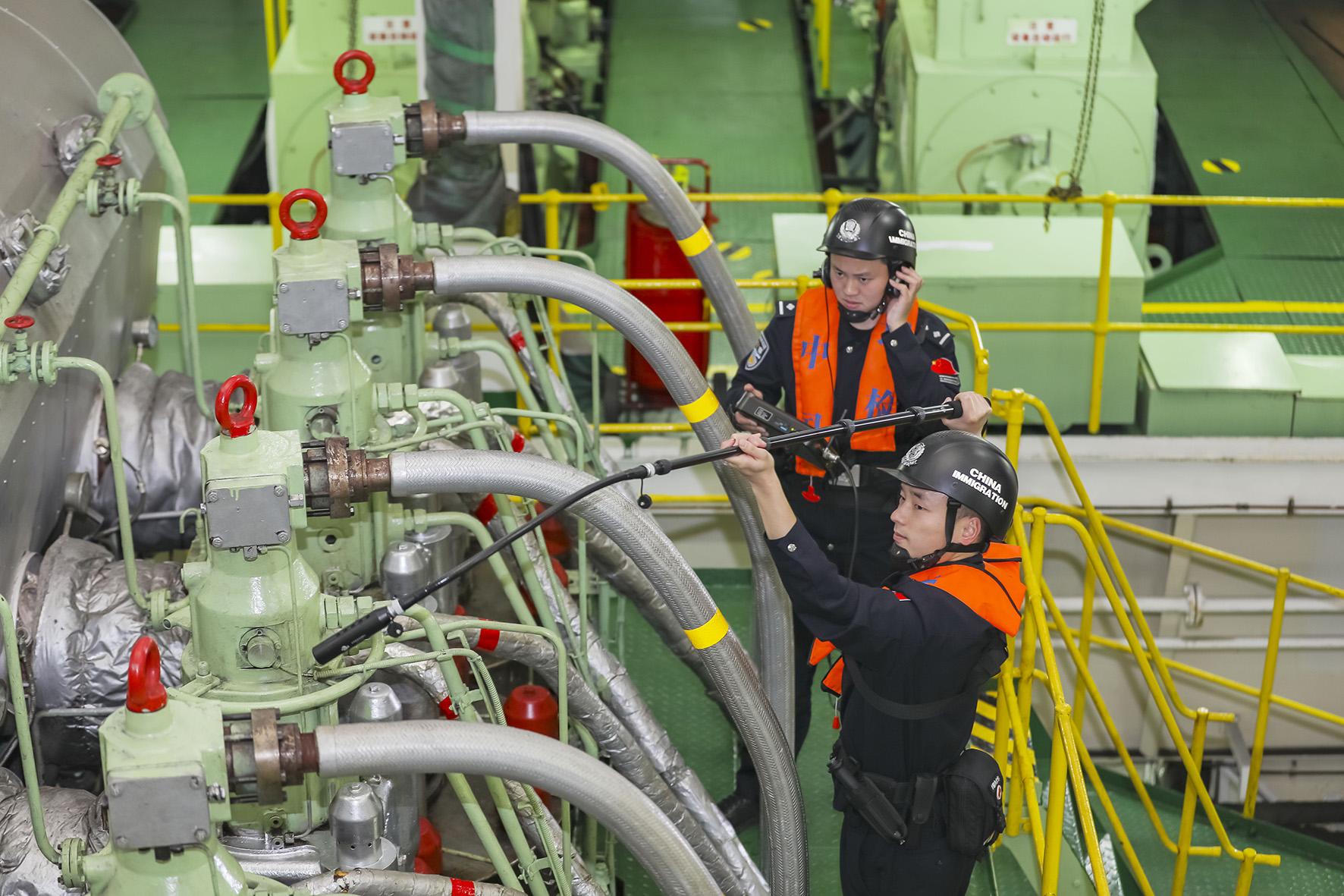 圖為3月1日,移民管理警察在貨輪機(jī)艙內(nèi)運(yùn)用紅外伸縮檢測儀進(jìn)行查驗(yàn)。