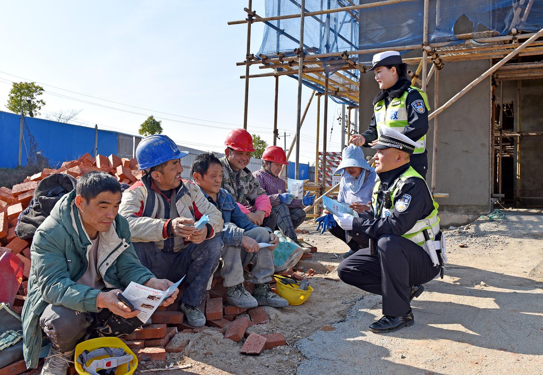 圖為民警向公路沿線建筑工地務工人員普及交通安全知識。