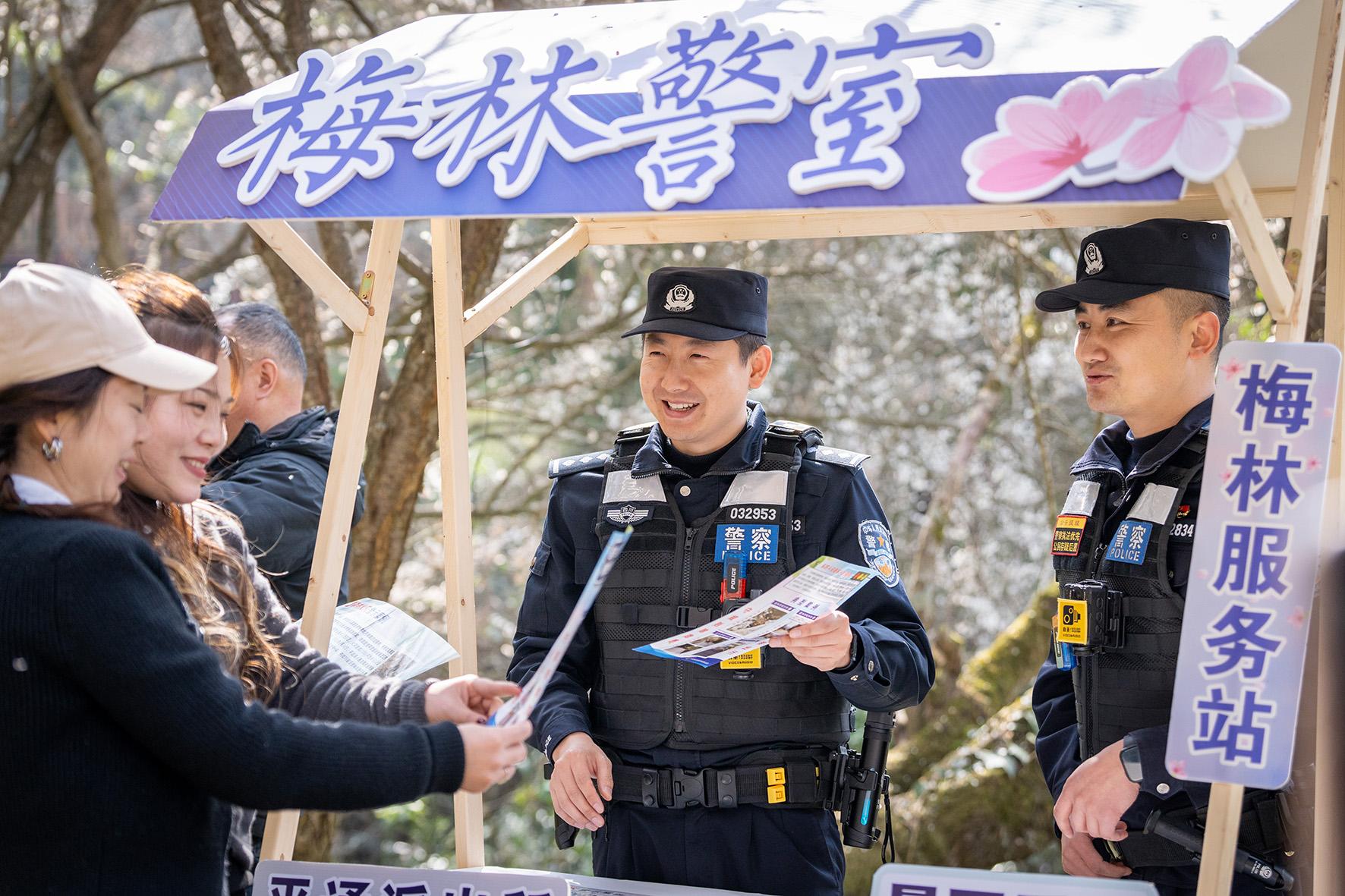 3月19日,四川省綿陽(yáng)市平武縣公安局在梅林景區(qū)設(shè)立的梅林警室,向游客宣講反詐、防火等知識(shí)。