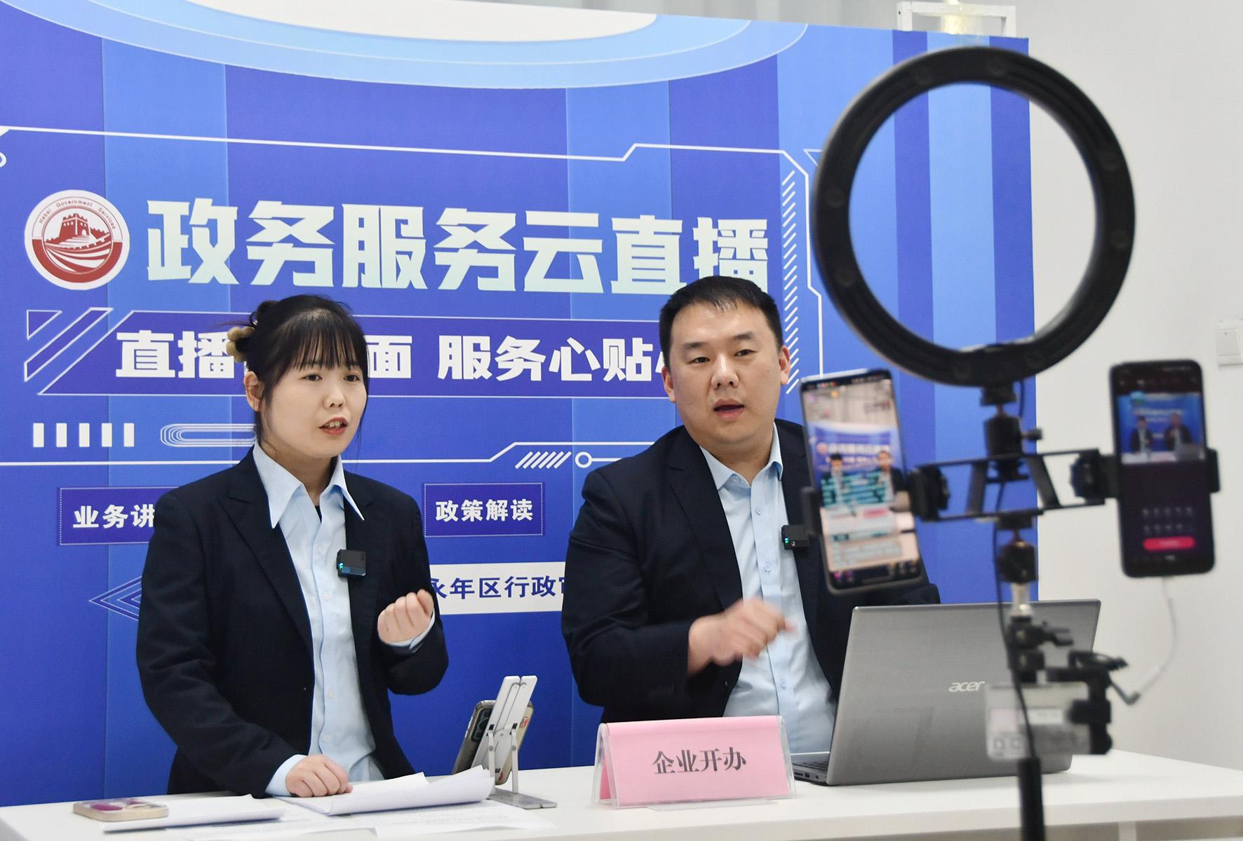 圖為3月25日,工作人員在永年區(qū)政務(wù)服務(wù)中心通過(guò)直播的方式講解企業(yè)開辦網(wǎng)上辦理步驟。