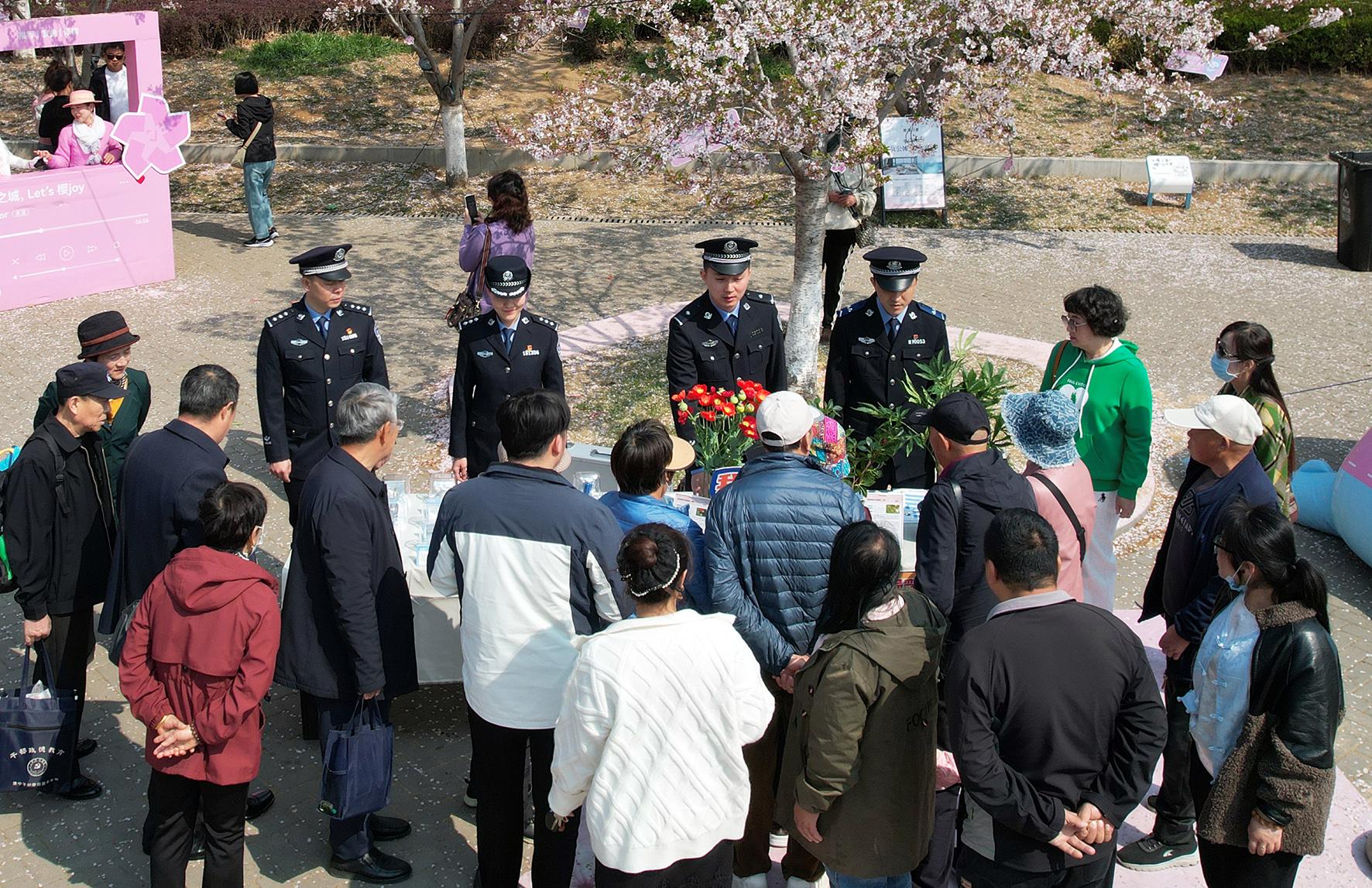 4月9日,山東省煙臺市公安局牟平分局禁毒大隊(duì)民警在龍湖櫻花大道通過實(shí)物講解、發(fā)放傳單等形式,向市民和游客宣傳禁毒知識。