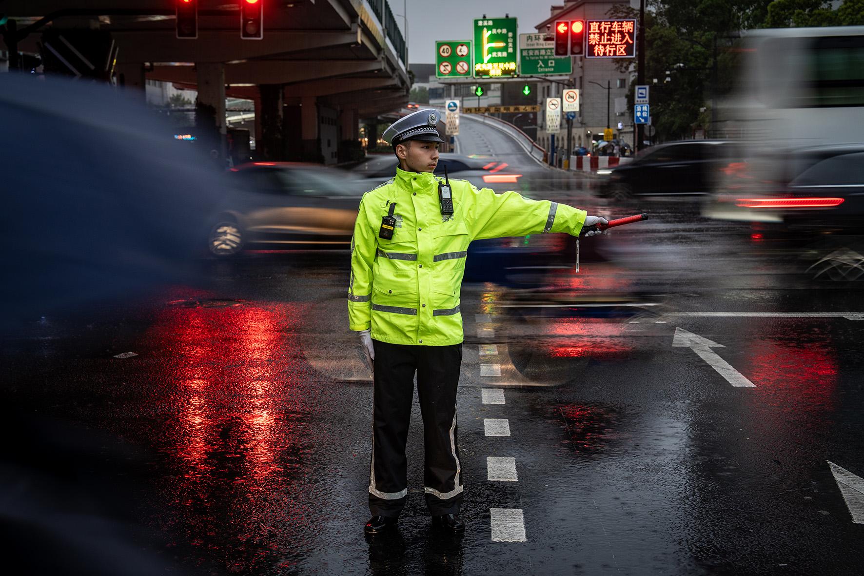 5月8日晚,上海市部分地區(qū)迎來強降雨。上海市公安局普陀分局交管支隊三大隊民警在中山北路金沙江路路口疏導(dǎo)人流。
