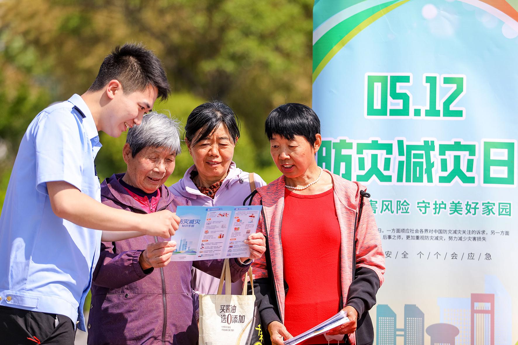 5月12日,在山東省青島市李滄區(qū)李滄文化公園舉辦的“全國防災(zāi)減災(zāi)日”集中宣傳活動(dòng)中,應(yīng)急工作人員向市民介紹防災(zāi)減災(zāi)知識(shí)。