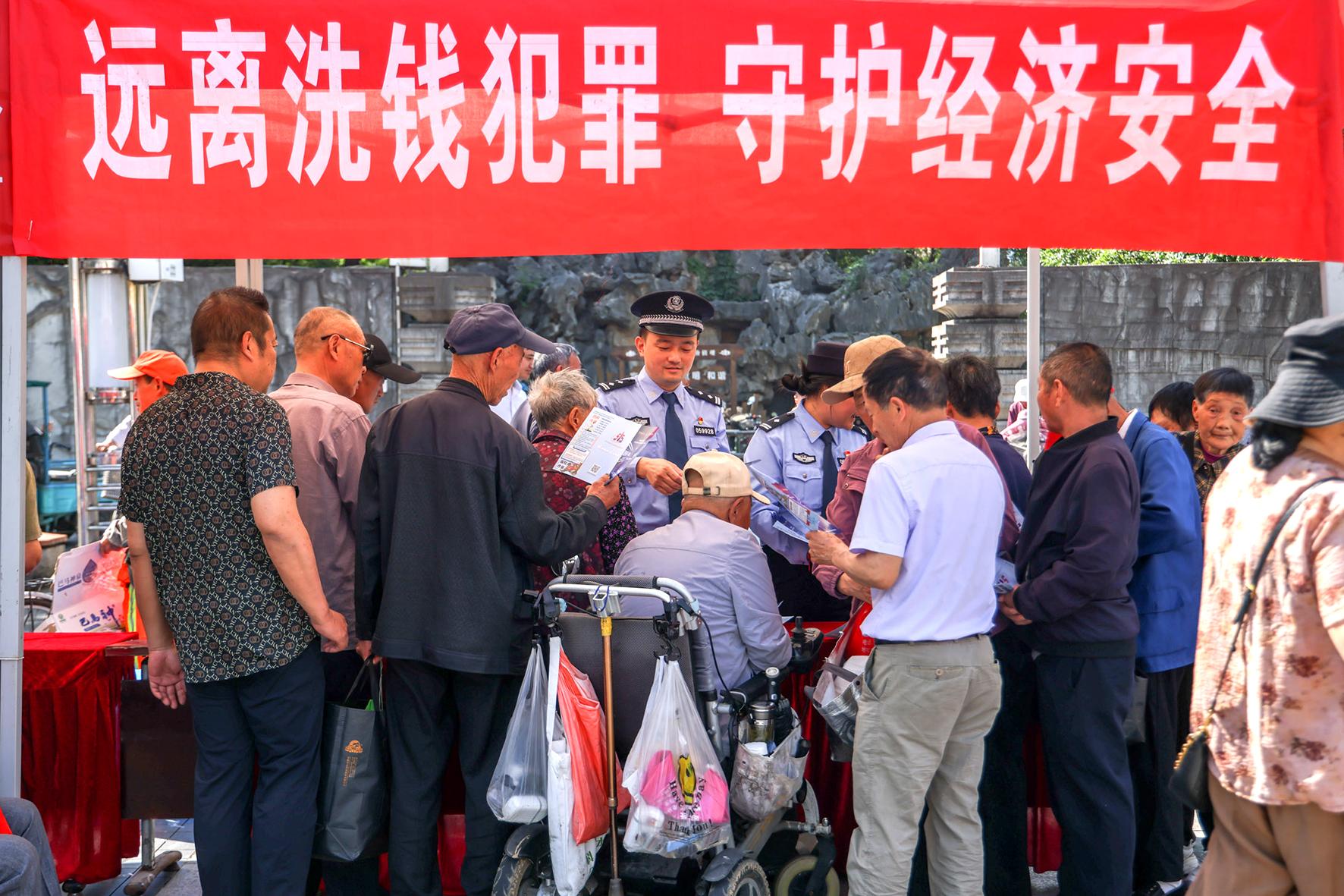 5月14日,安徽省 廣德市公安局經(jīng)偵民警在夫子廟廣場(chǎng)向群眾宣講防范非法集資、養(yǎng)老詐騙、高利轉(zhuǎn)貸等知識(shí),守護(hù)群眾的“錢(qián)袋子”。