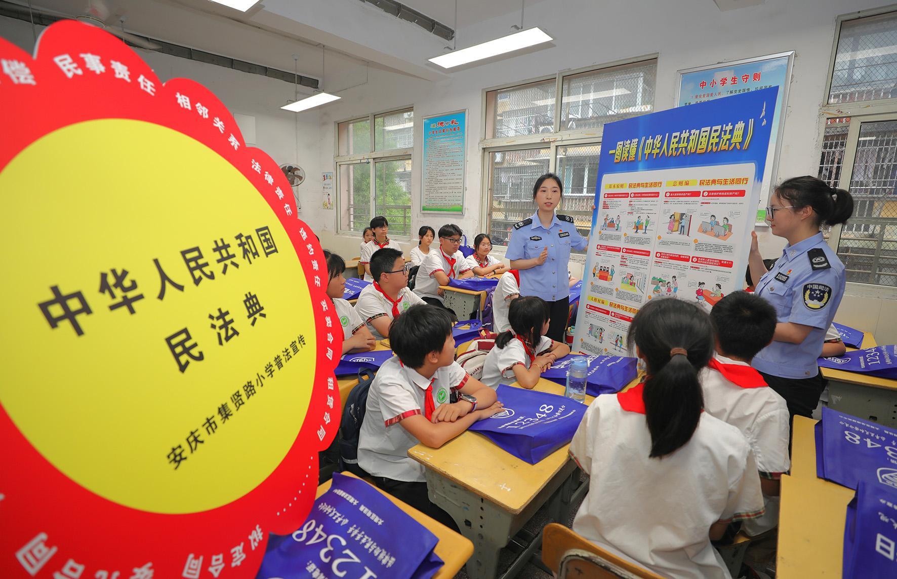 5月15日,安徽省安慶市大觀區(qū)司法局工作人員走進(jìn)集賢路小學(xué)開展“‘民法’宣傳進(jìn)課堂‘典’亮校園護(hù)成長”主題宣傳活動(dòng)。