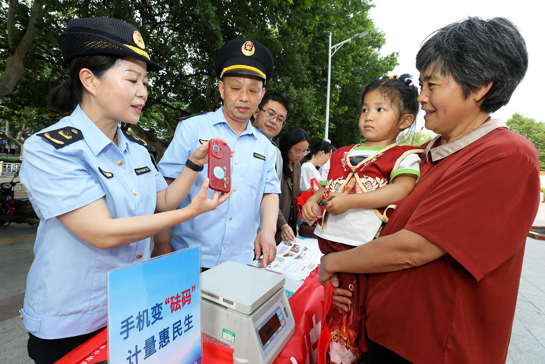 5月16日,在“世界計(jì)量日”到來之際,安徽省淮北市市場監(jiān)督管理部門在淮海路舉行“手機(jī)變砝碼 計(jì)量惠民生”電子計(jì)價秤防作弊科普宣傳活動。
