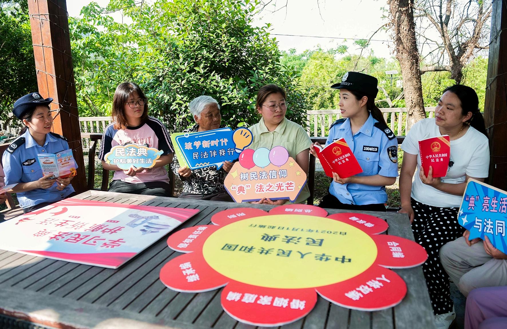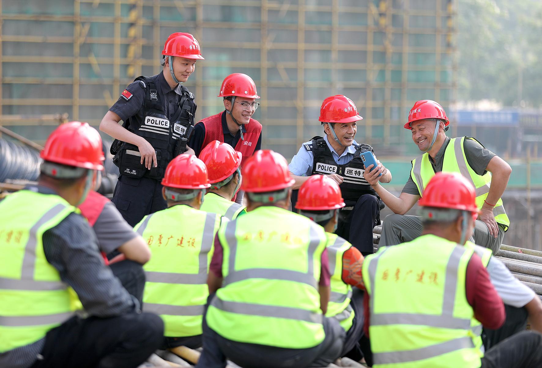 5月20日,在湖北省荊門市漳河新區(qū)一處建筑工地,荊門市公安局巡特警支隊(duì)生態(tài)運(yùn)動(dòng)公園警務(wù)站民警利用“班前會(huì)”,向工友們普及民法典相關(guān)知識。
