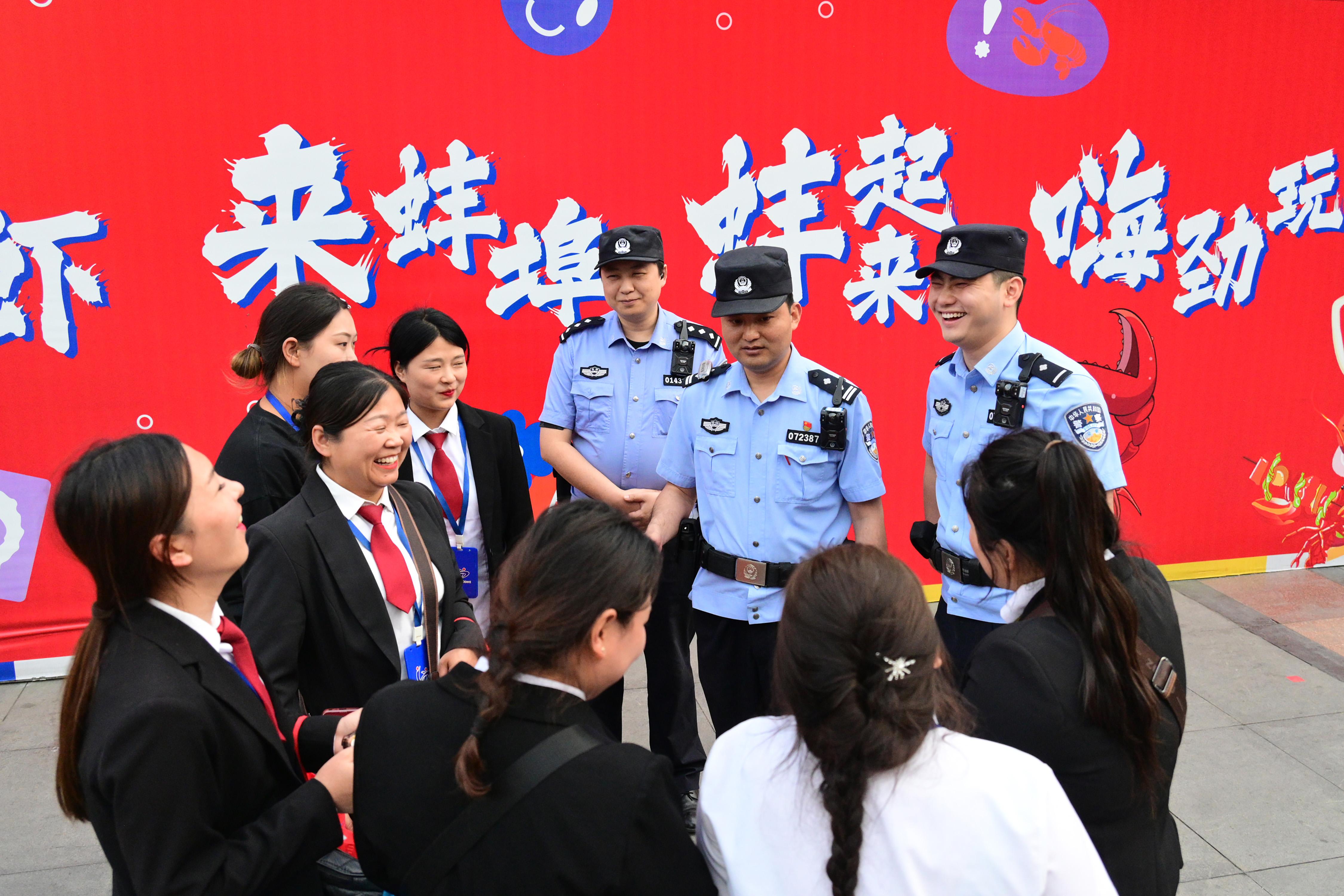 5月23日,安徽省蚌埠市公安局蚌山分局民警輔警在龍蝦節(jié)活動現(xiàn)場執(zhí)勤,并開展安全宣傳。