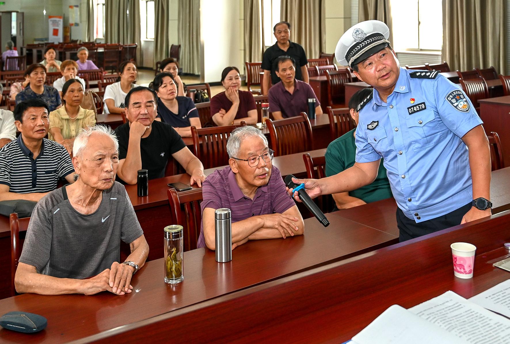 6月23日,在安徽省馬鞍山市和縣老年大學(xué),全國公安系統(tǒng)二級英雄模范、和縣公安局交管大隊民警杜昌來正在給老年大學(xué)的學(xué)員開展交通安全專題講座。