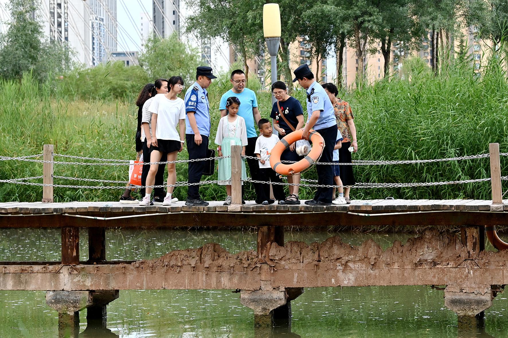 6月28日,甘肅省蘭州市公安局安寧分局銀灘路派出所民警,在轄區(qū)濕地公園加強(qiáng)重點(diǎn)水域的巡邏管控,向游客宣傳防溺水安全知識(shí)。