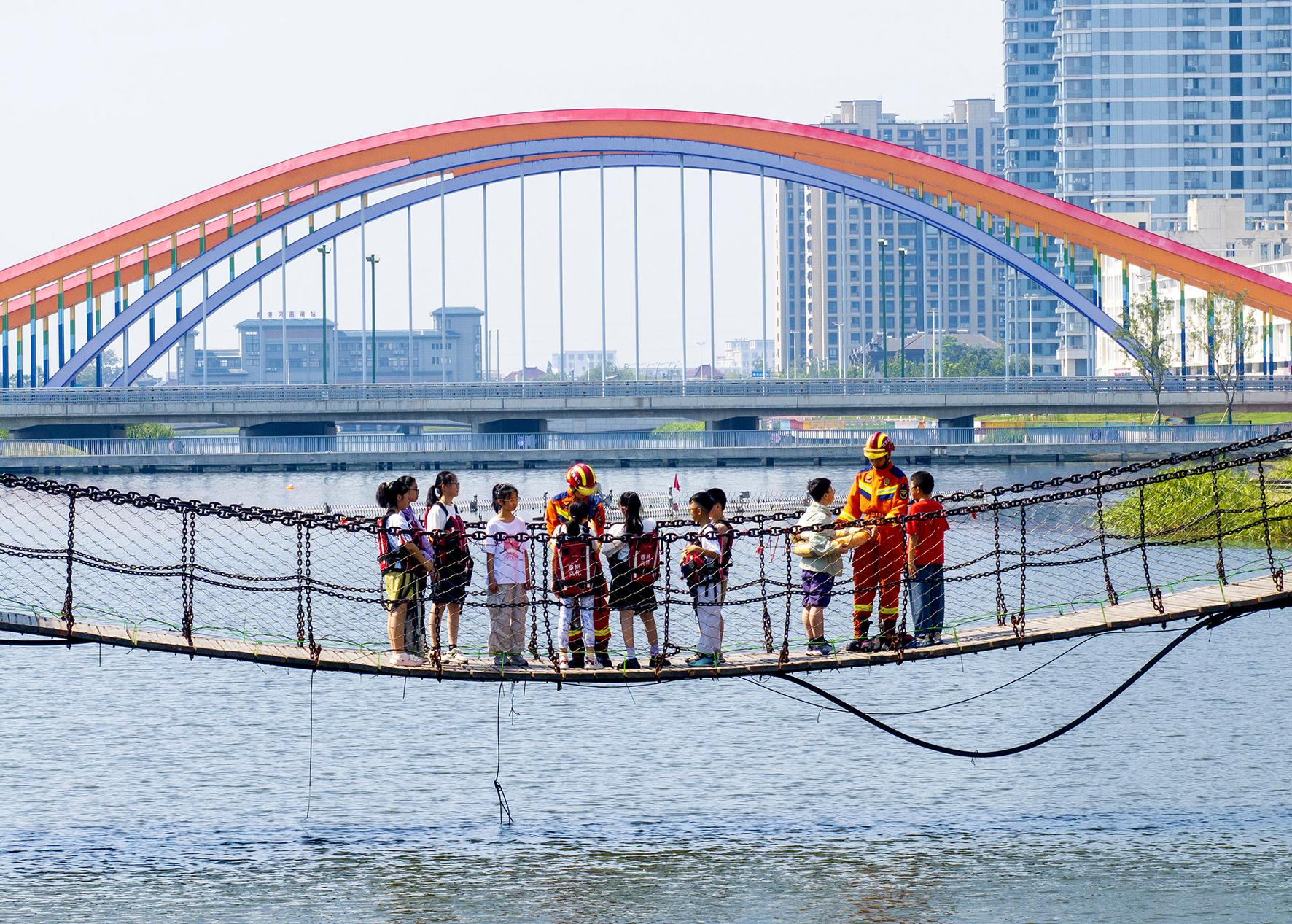 7月2日,在江蘇省興化市昭陽(yáng)湖公園,興化市消防救援大隊(duì)消防員指導(dǎo)興化市新生中心小學(xué)“日新公益暑托班”學(xué)生學(xué)習(xí)防溺水自救互救的基本知識(shí)與技能。