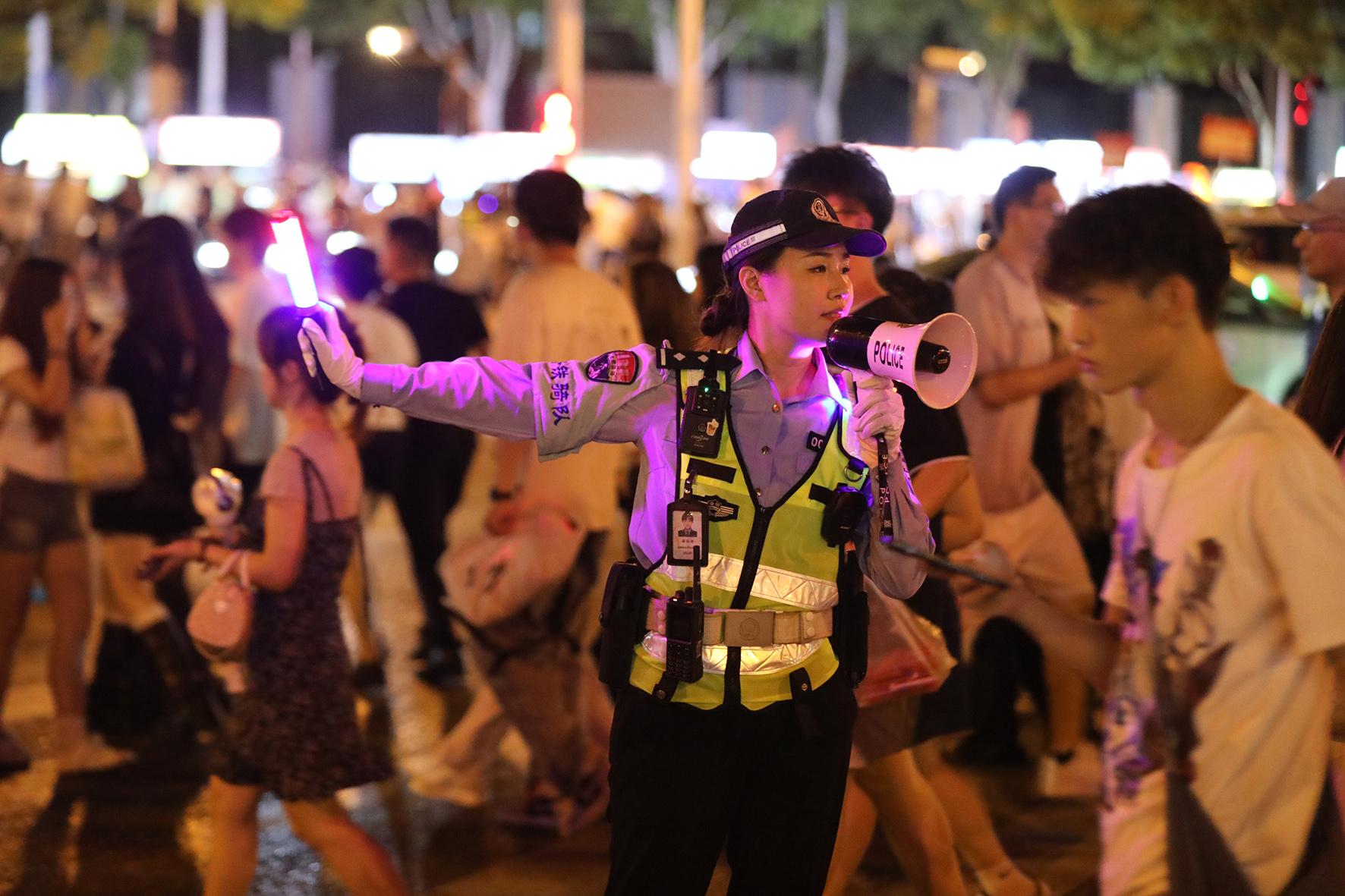7月19日晚,安徽省合肥市公安局交警支隊(duì)民警在演出場(chǎng)館周邊維護(hù)道路交通秩序。