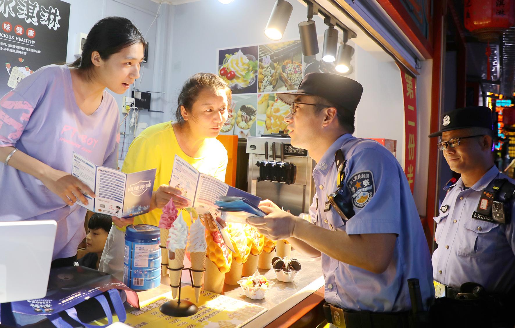圖為7月21日,民輔警在轄區(qū)“九江之夜”開(kāi)展反詐宣傳。