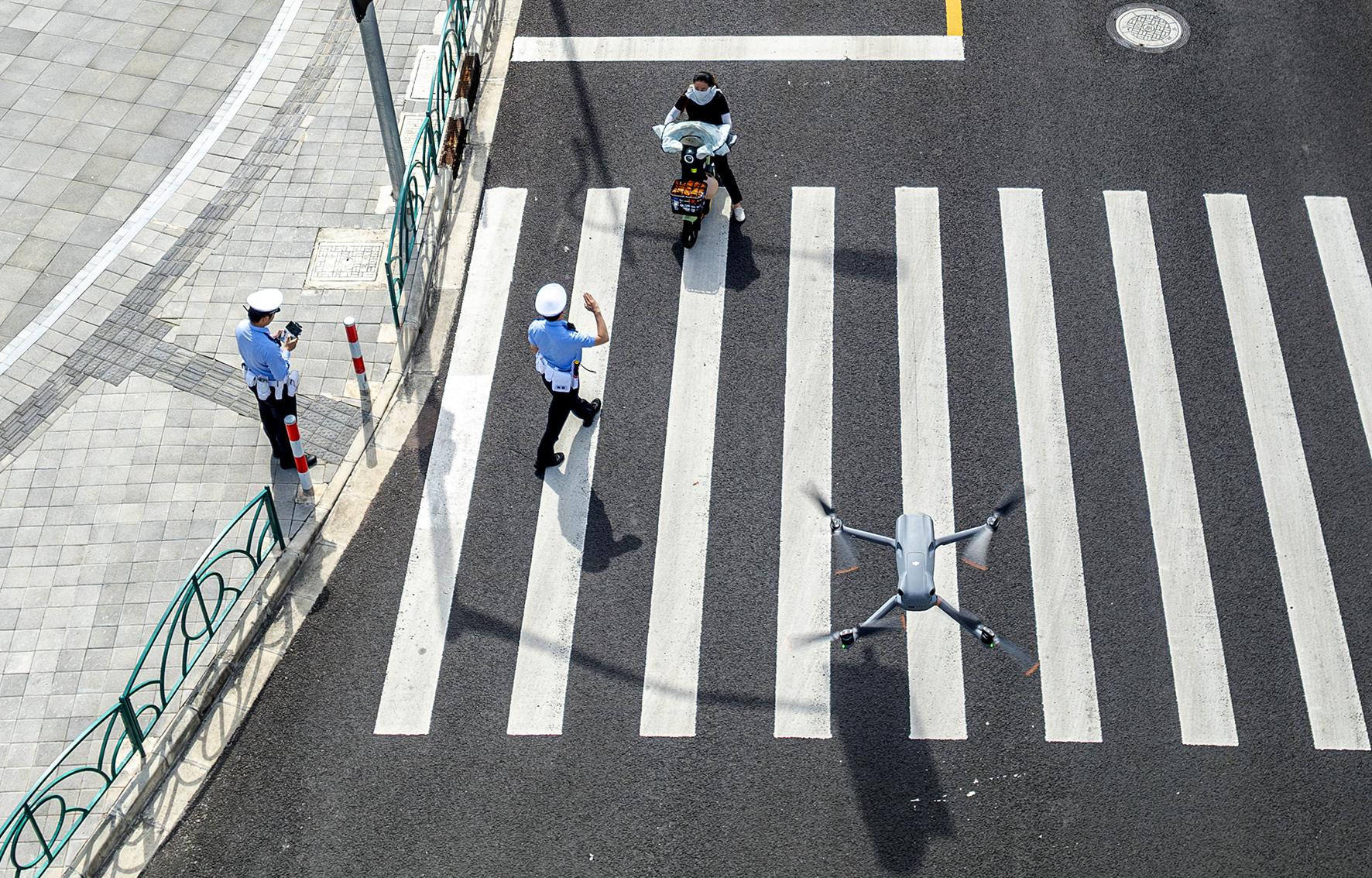 圖為7月22日,民輔警利用無(wú)人機(jī)查處一起非機(jī)動(dòng)車交通違法行為。