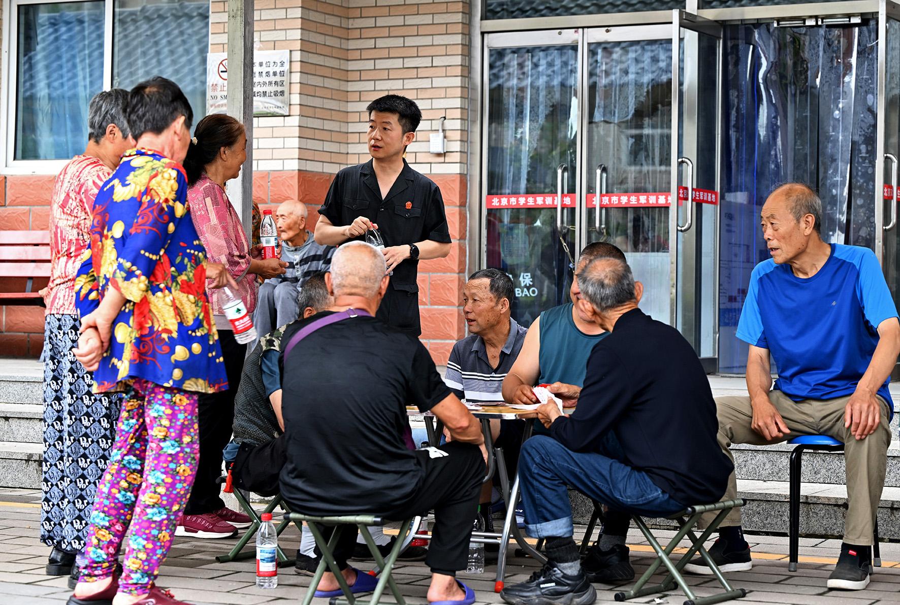 8月4日,北京市懷柔區(qū)學(xué)生軍訓(xùn)基地安置點(diǎn),懷柔區(qū)人民法院防汛小分隊(duì)成員、湯河口法庭副庭長(zhǎng)周科熱情地與來(lái)自楊樹(shù)下村的池大媽打著招呼。今年5月,周科帶隊(duì)去楊樹(shù)下村開(kāi)展民法典宣傳月普法活動(dòng)。