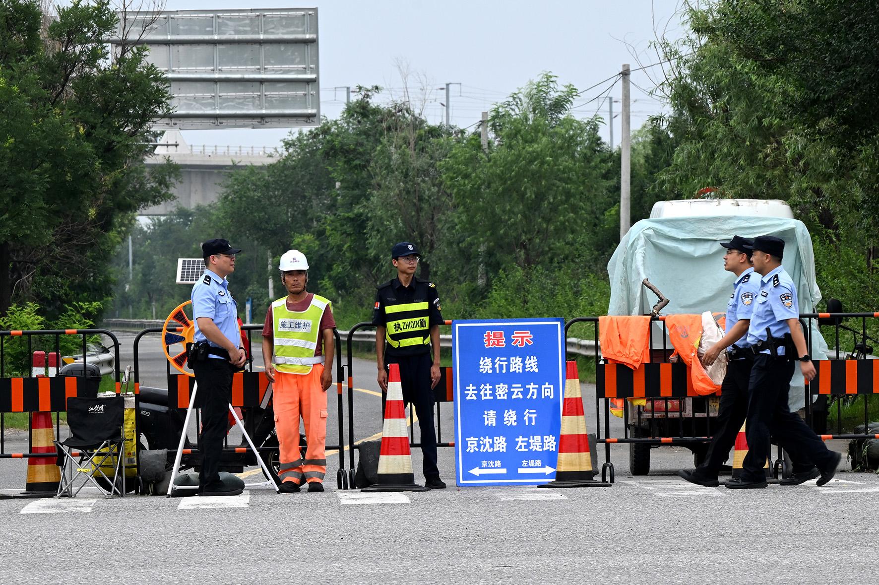 8月4日,北京市公安局懷柔分局楊宋派出所民警對(duì)仍處于交通管控狀態(tài)的潮白河右堤路進(jìn)行巡查。